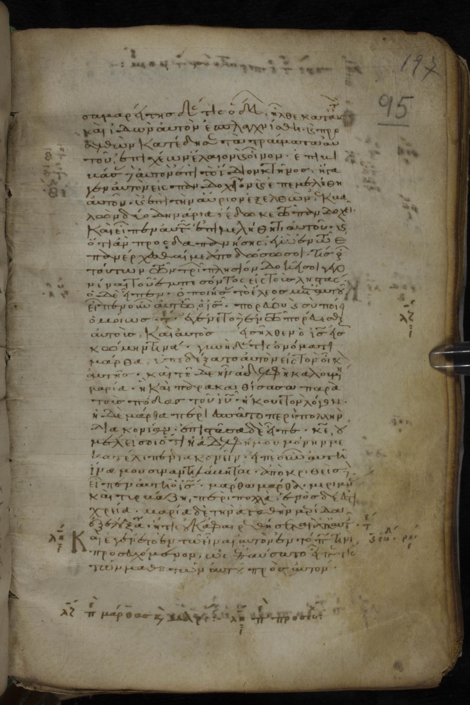 Eleventh century minuscule of the Gospels, the Apostolos, and Paul on parchment; 318 leaves, 1 column, 34 lines per column. Images were taken at the National Library of Greece in Athens.