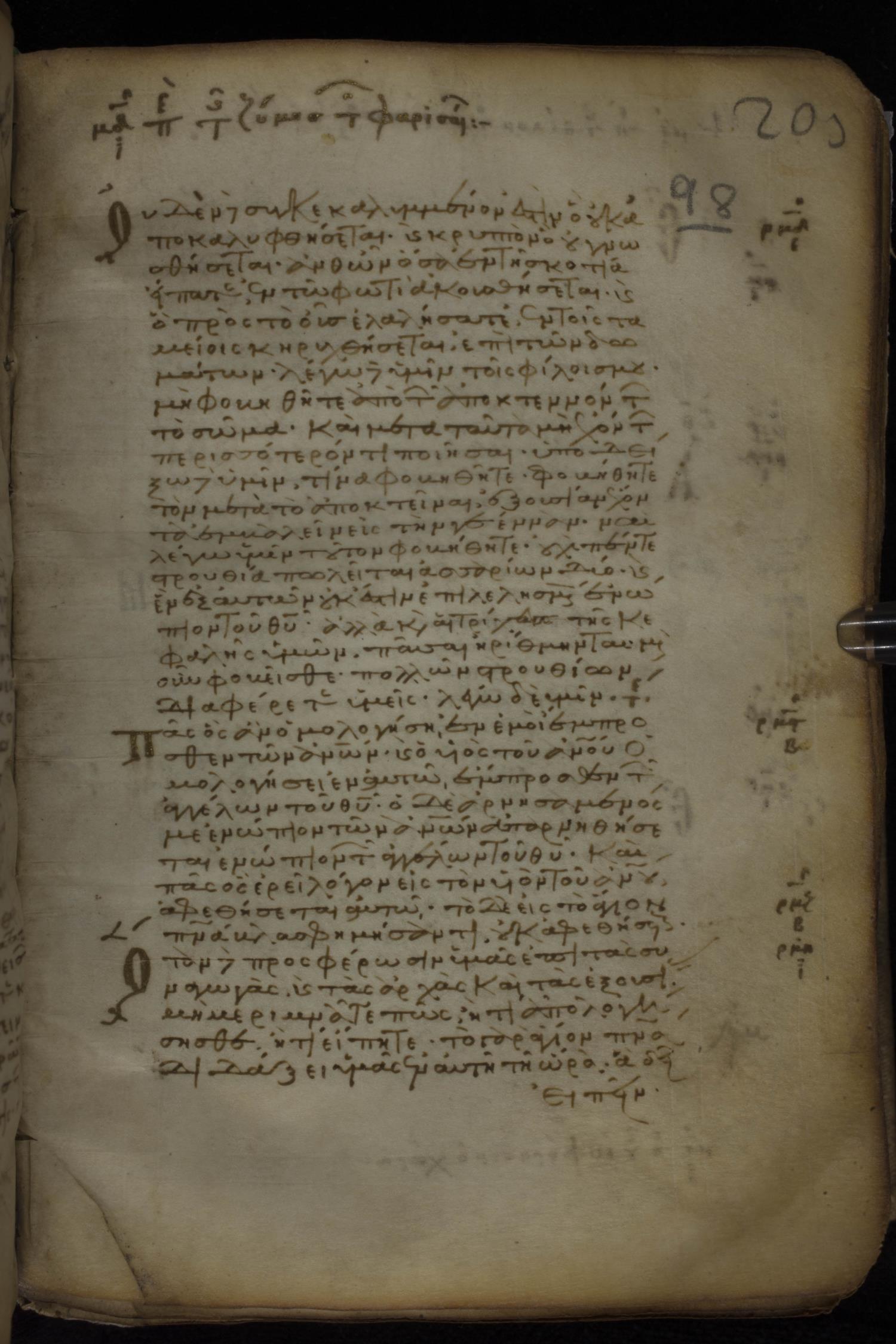 Eleventh century minuscule of the Gospels, the Apostolos, and Paul on parchment; 318 leaves, 1 column, 34 lines per column. Images were taken at the National Library of Greece in Athens.