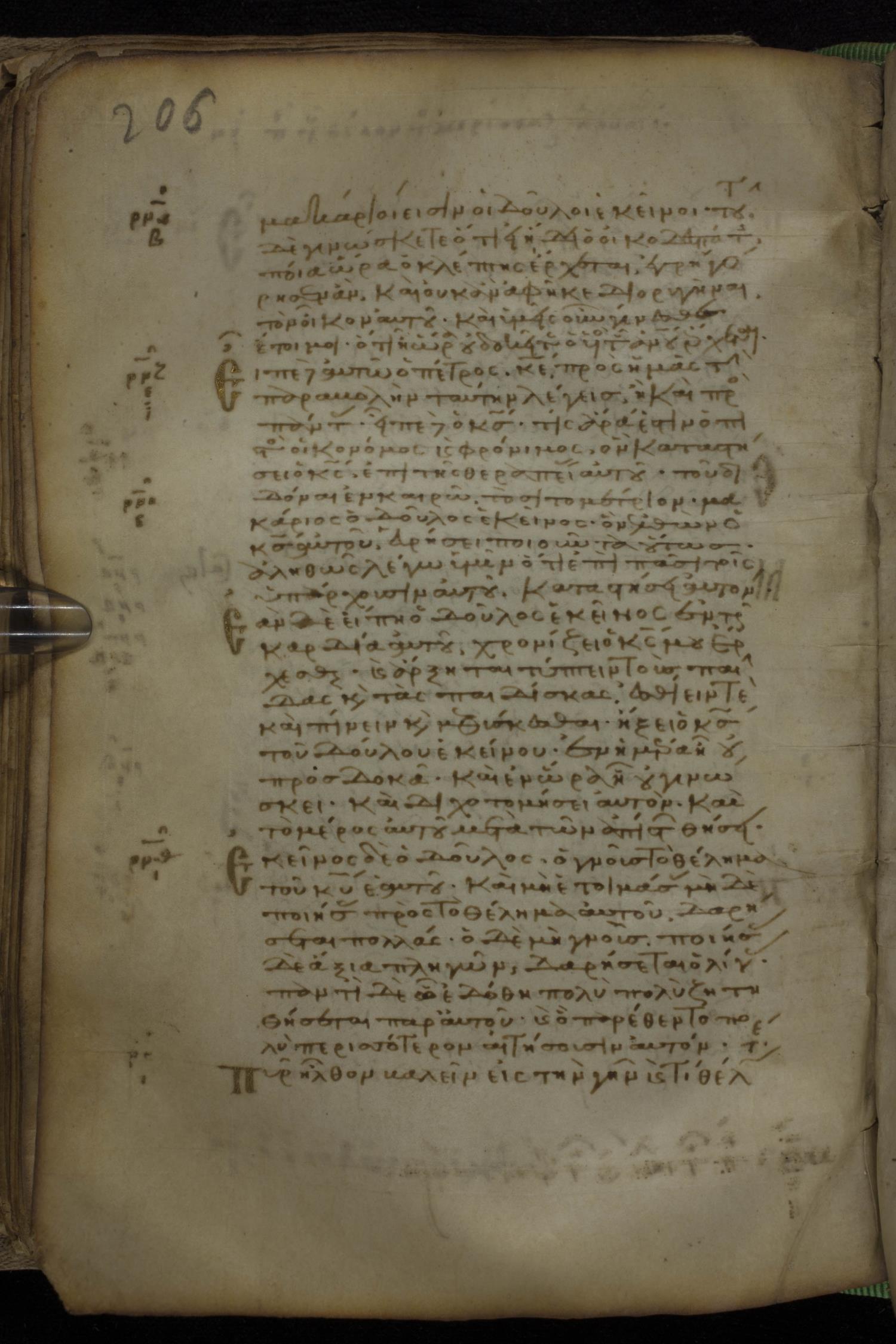 Eleventh century minuscule of the Gospels, the Apostolos, and Paul on parchment; 318 leaves, 1 column, 34 lines per column. Images were taken at the National Library of Greece in Athens.