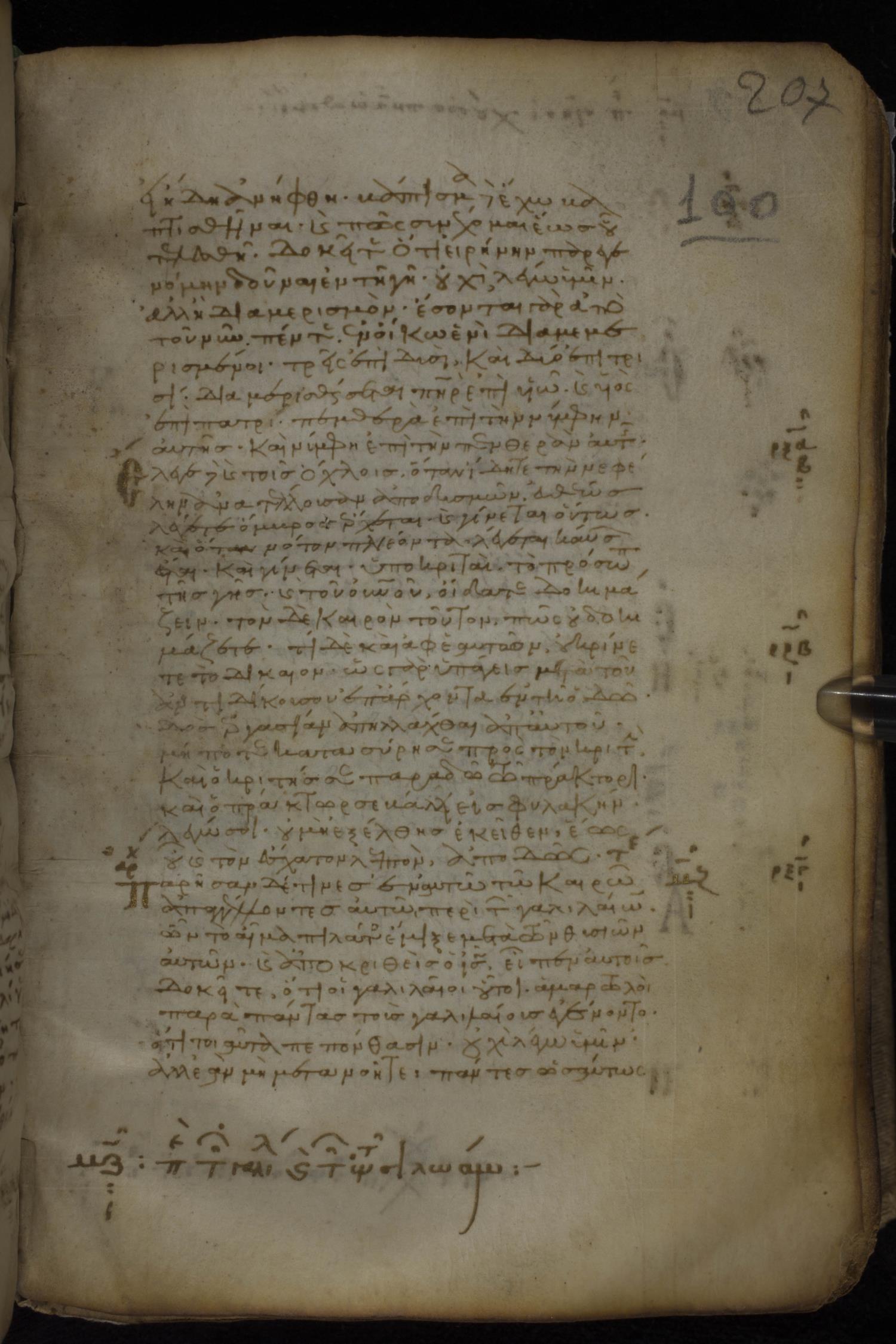 Eleventh century minuscule of the Gospels, the Apostolos, and Paul on parchment; 318 leaves, 1 column, 34 lines per column. Images were taken at the National Library of Greece in Athens.