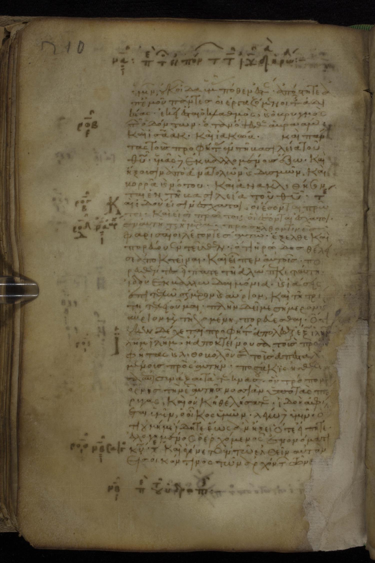 Eleventh century minuscule of the Gospels, the Apostolos, and Paul on parchment; 318 leaves, 1 column, 34 lines per column. Images were taken at the National Library of Greece in Athens.