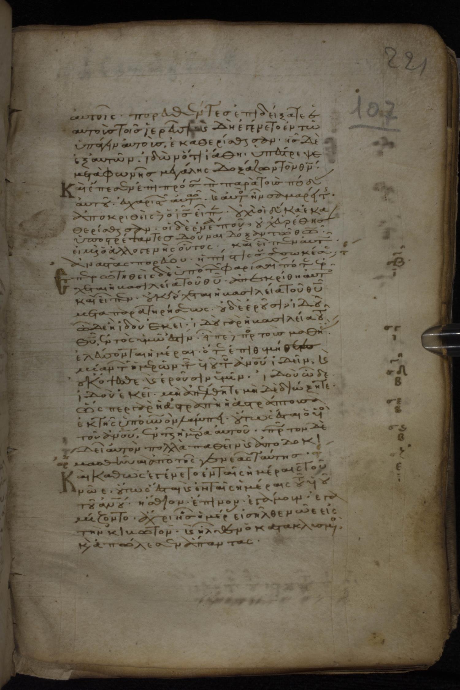 Eleventh century minuscule of the Gospels, the Apostolos, and Paul on parchment; 318 leaves, 1 column, 34 lines per column. Images were taken at the National Library of Greece in Athens.