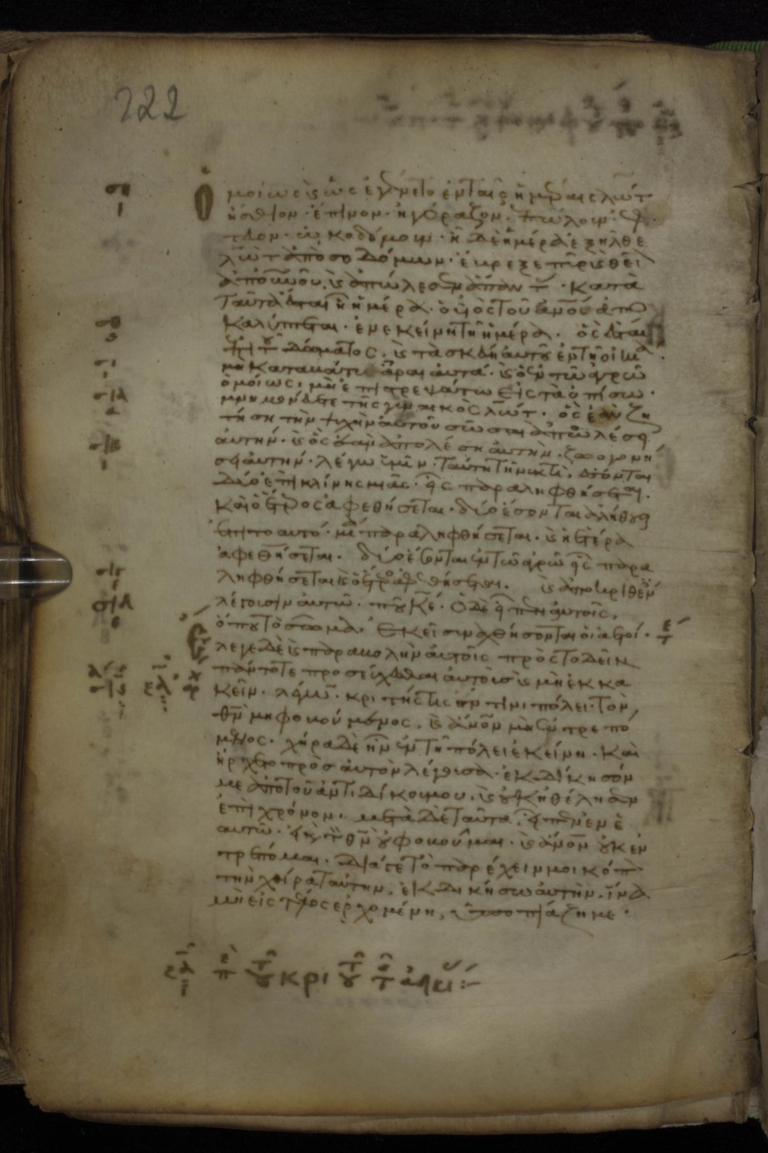 Eleventh century minuscule of the Gospels, the Apostolos, and Paul on parchment; 318 leaves, 1 column, 34 lines per column. Images were taken at the National Library of Greece in Athens.