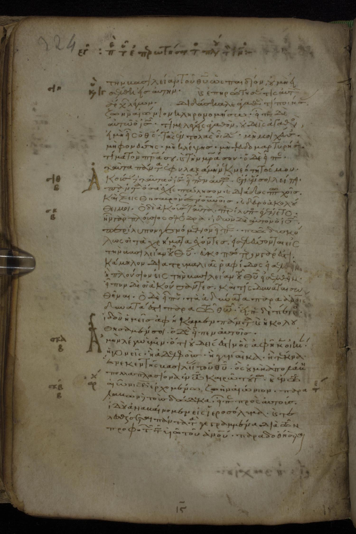 Eleventh century minuscule of the Gospels, the Apostolos, and Paul on parchment; 318 leaves, 1 column, 34 lines per column. Images were taken at the National Library of Greece in Athens.