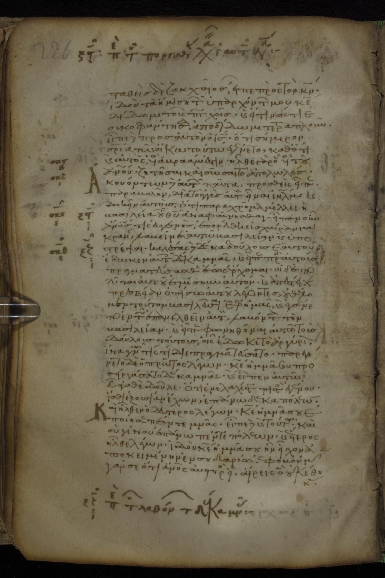 Eleventh century minuscule of the Gospels, the Apostolos, and Paul on parchment; 318 leaves, 1 column, 34 lines per column. Images were taken at the National Library of Greece in Athens.