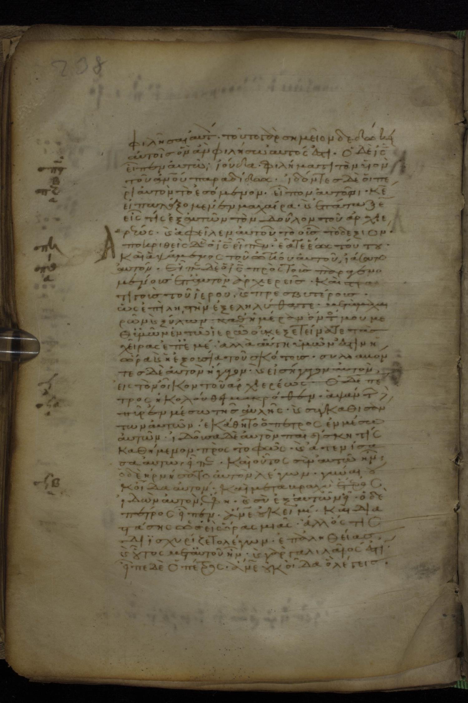 Eleventh century minuscule of the Gospels, the Apostolos, and Paul on parchment; 318 leaves, 1 column, 34 lines per column. Images were taken at the National Library of Greece in Athens.