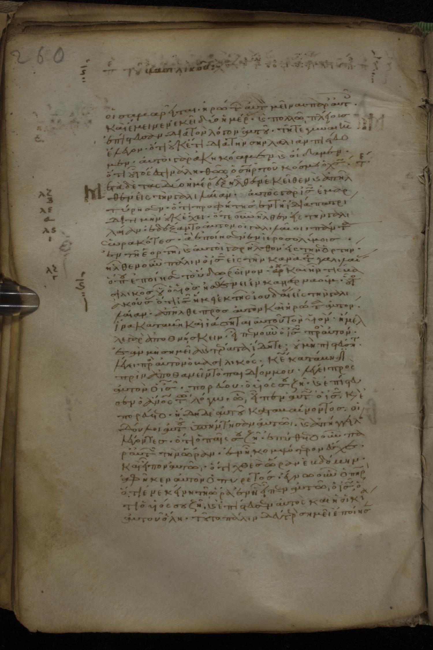 Eleventh century minuscule of the Gospels, the Apostolos, and Paul on parchment; 318 leaves, 1 column, 34 lines per column. Images were taken at the National Library of Greece in Athens.