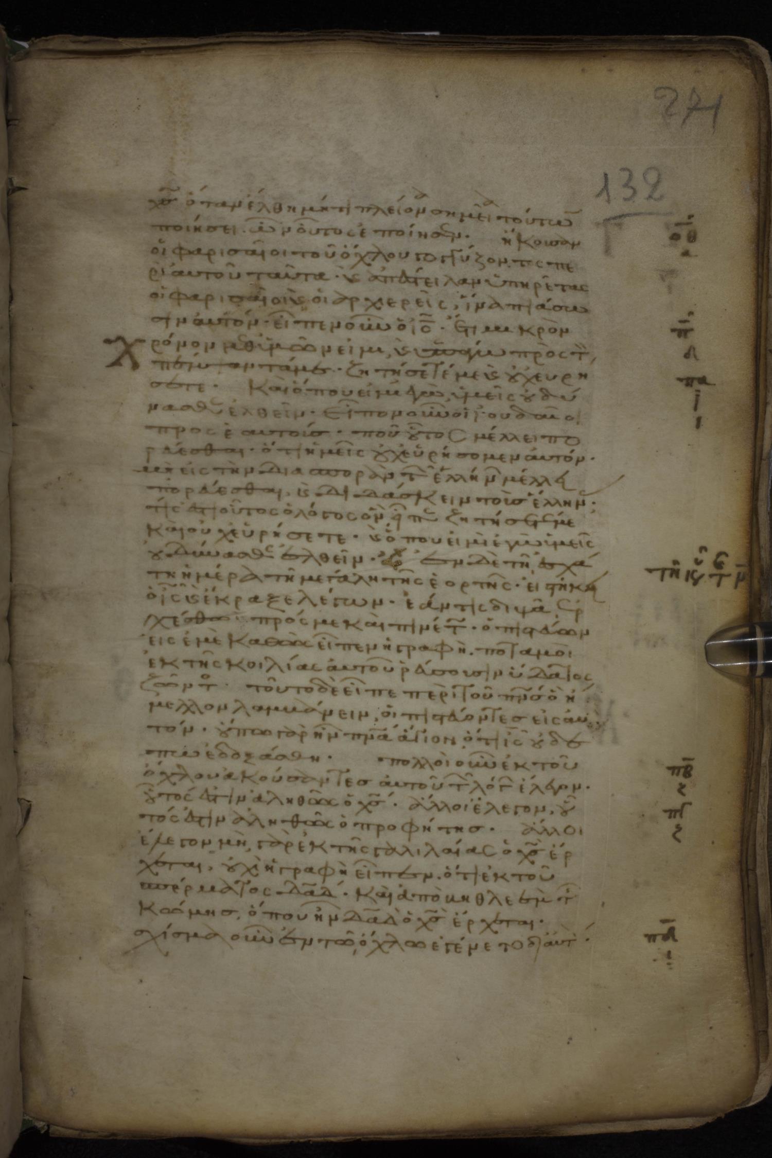 Eleventh century minuscule of the Gospels, the Apostolos, and Paul on parchment; 318 leaves, 1 column, 34 lines per column. Images were taken at the National Library of Greece in Athens.