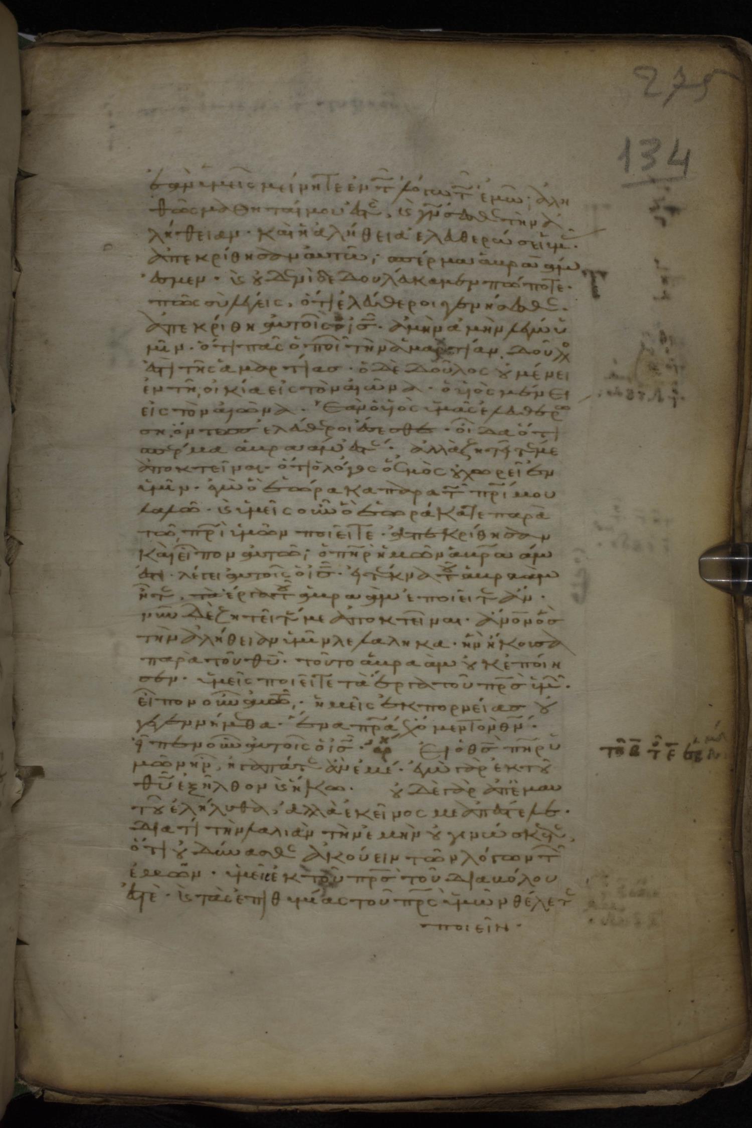 Eleventh century minuscule of the Gospels, the Apostolos, and Paul on parchment; 318 leaves, 1 column, 34 lines per column. Images were taken at the National Library of Greece in Athens.