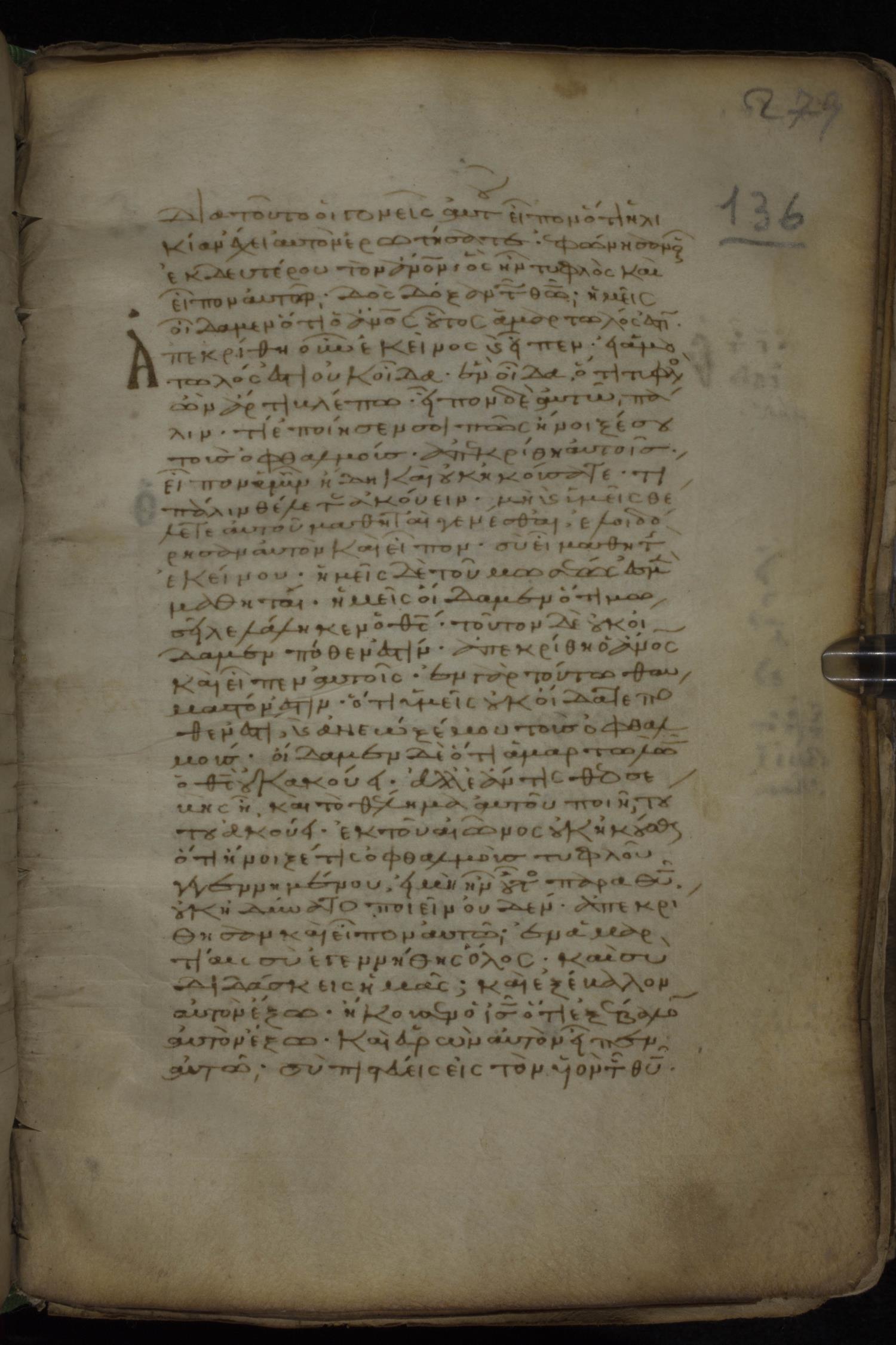 Eleventh century minuscule of the Gospels, the Apostolos, and Paul on parchment; 318 leaves, 1 column, 34 lines per column. Images were taken at the National Library of Greece in Athens.