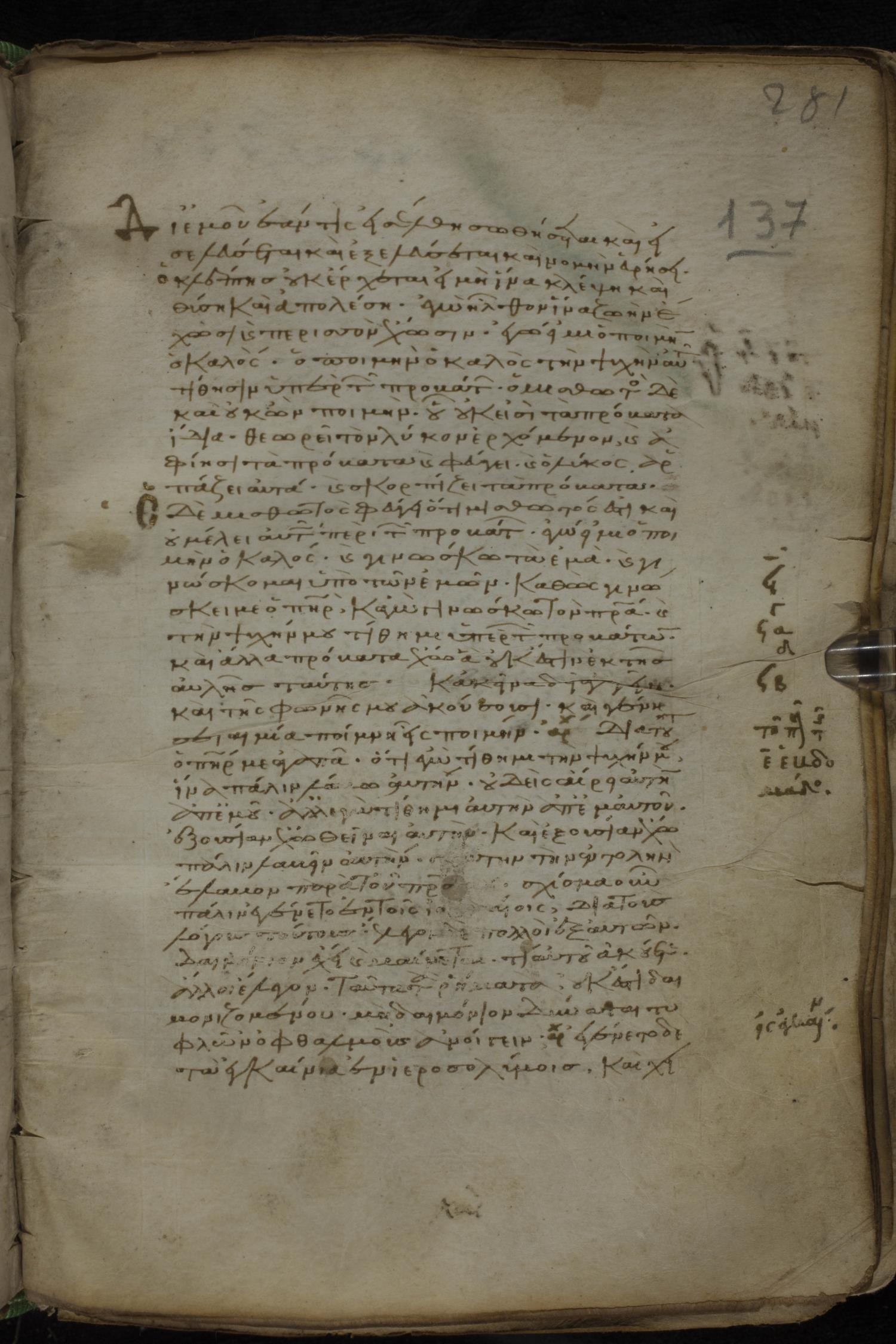 Eleventh century minuscule of the Gospels, the Apostolos, and Paul on parchment; 318 leaves, 1 column, 34 lines per column. Images were taken at the National Library of Greece in Athens.