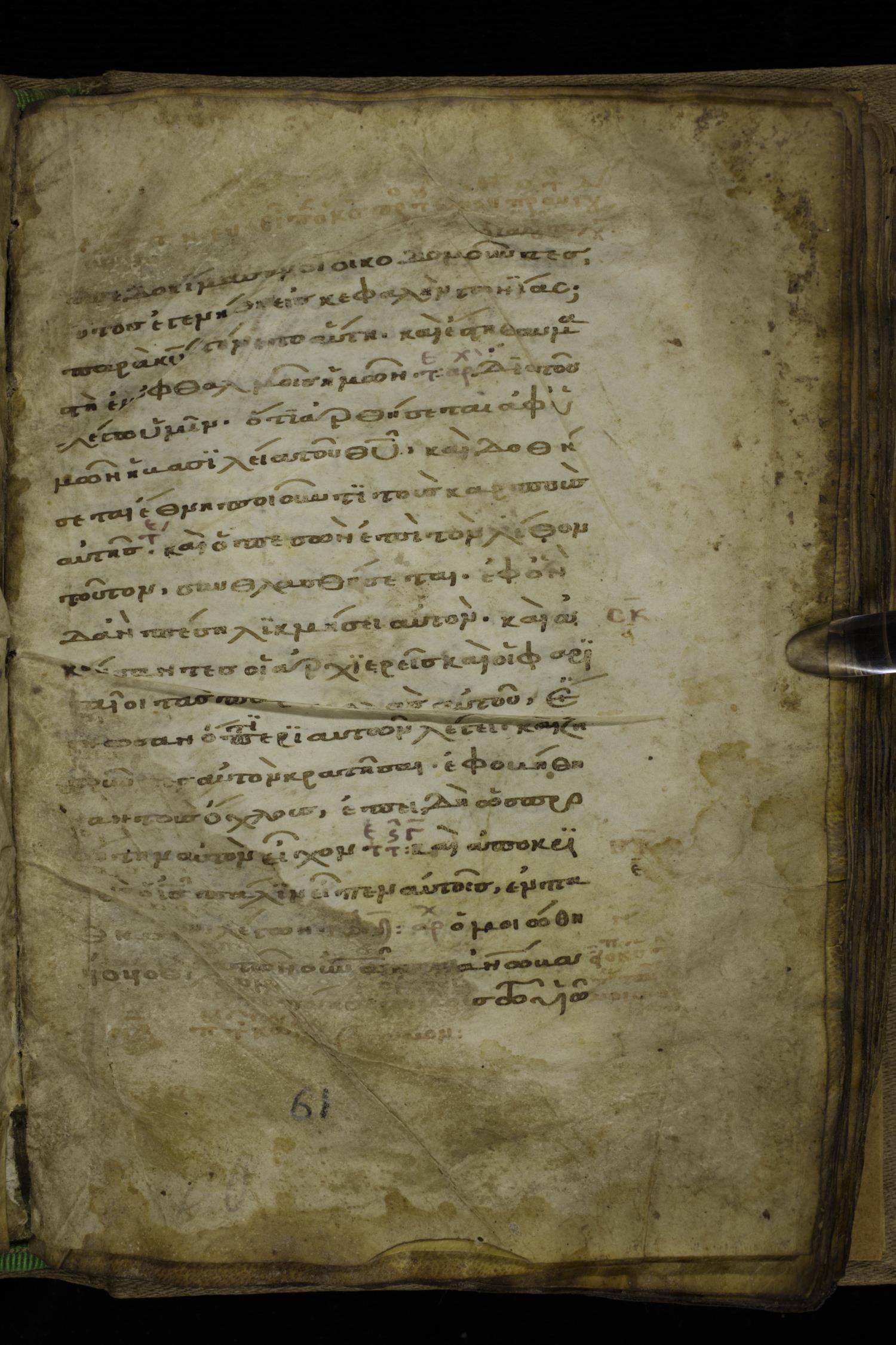 Eleventh century minuscule of the Gospels on parchment; 264 total leaves, 1 column, 20 lines per column. The manuscript is in two locations; both the portion at Muenster (148 leaves) and the portion at the National Library of Greece in Athens (116 leaves) have been digitized by CSNTM.