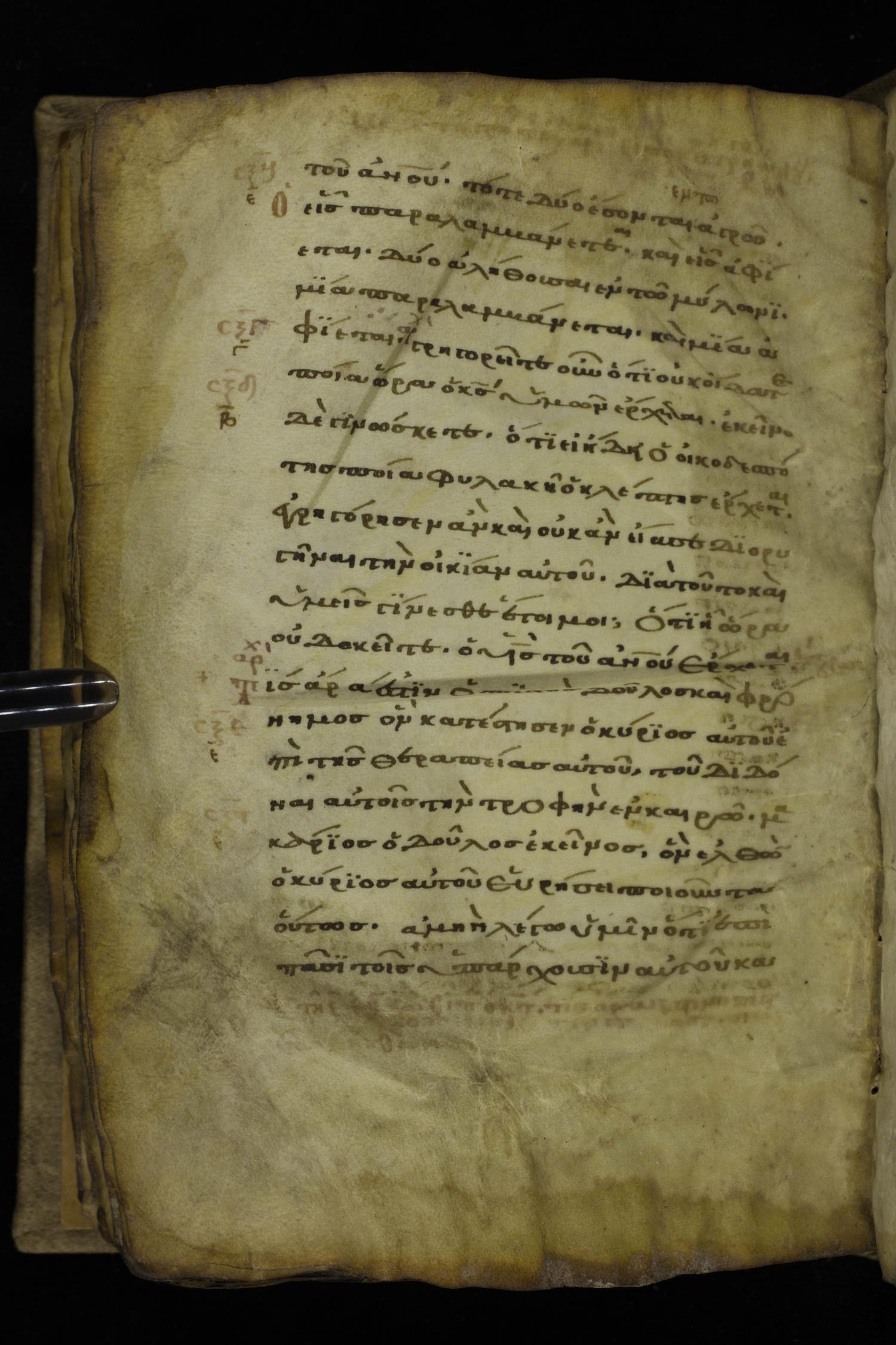Eleventh century minuscule of the Gospels on parchment; 264 total leaves, 1 column, 20 lines per column. The manuscript is in two locations; both the portion at Muenster (148 leaves) and the portion at the National Library of Greece in Athens (116 leaves) have been digitized by CSNTM.