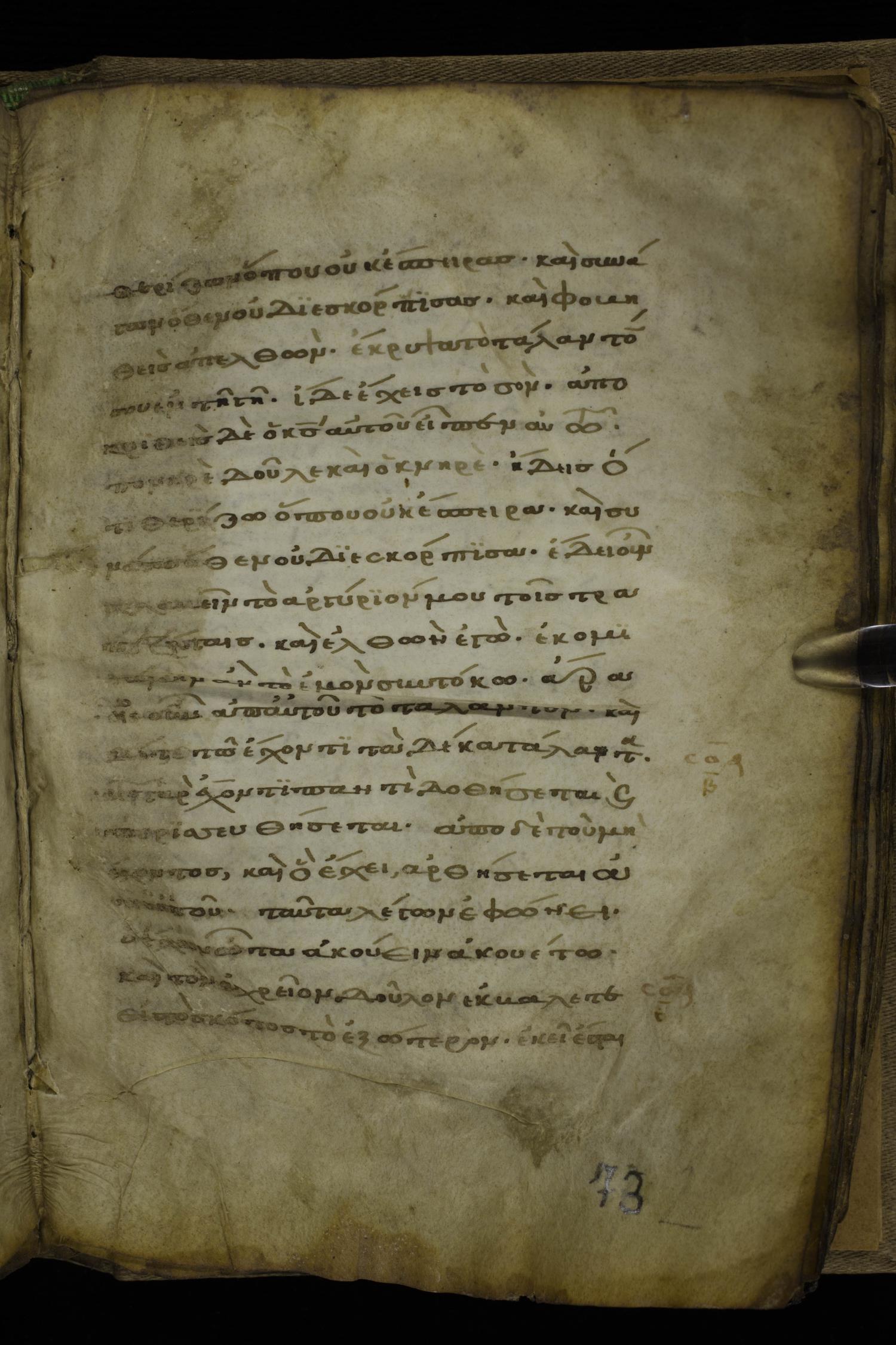 Eleventh century minuscule of the Gospels on parchment; 264 total leaves, 1 column, 20 lines per column. The manuscript is in two locations; both the portion at Muenster (148 leaves) and the portion at the National Library of Greece in Athens (116 leaves) have been digitized by CSNTM.
