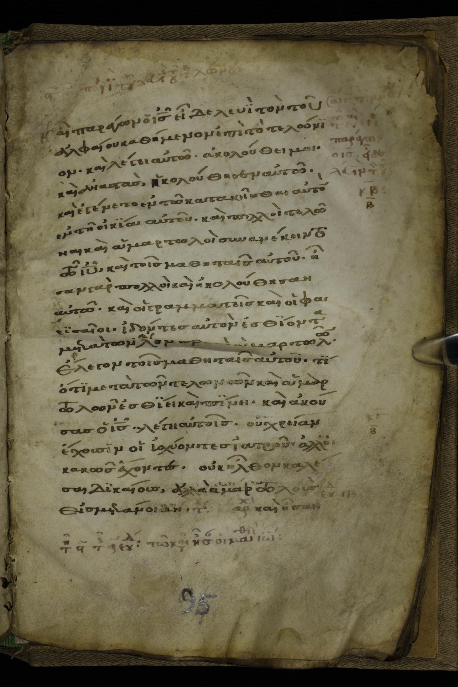 Eleventh century minuscule of the Gospels on parchment; 264 total leaves, 1 column, 20 lines per column. The manuscript is in two locations; both the portion at Muenster (148 leaves) and the portion at the National Library of Greece in Athens (116 leaves) have been digitized by CSNTM.