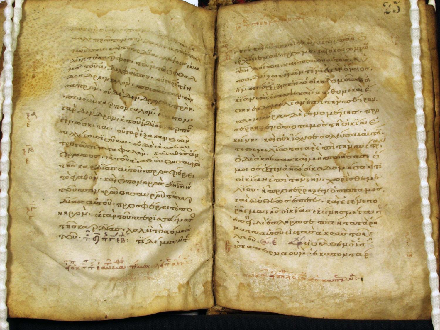 Eleventh century manuscript of the Gospels on parchment; 264 total leaves, 1 column, 20 lines per column. The manuscript is in two locations; both the portion at Muenster (148 leaves) and the portion at the National Library of Greece in Athens (116 leaves) have been digitized by CSNTM.