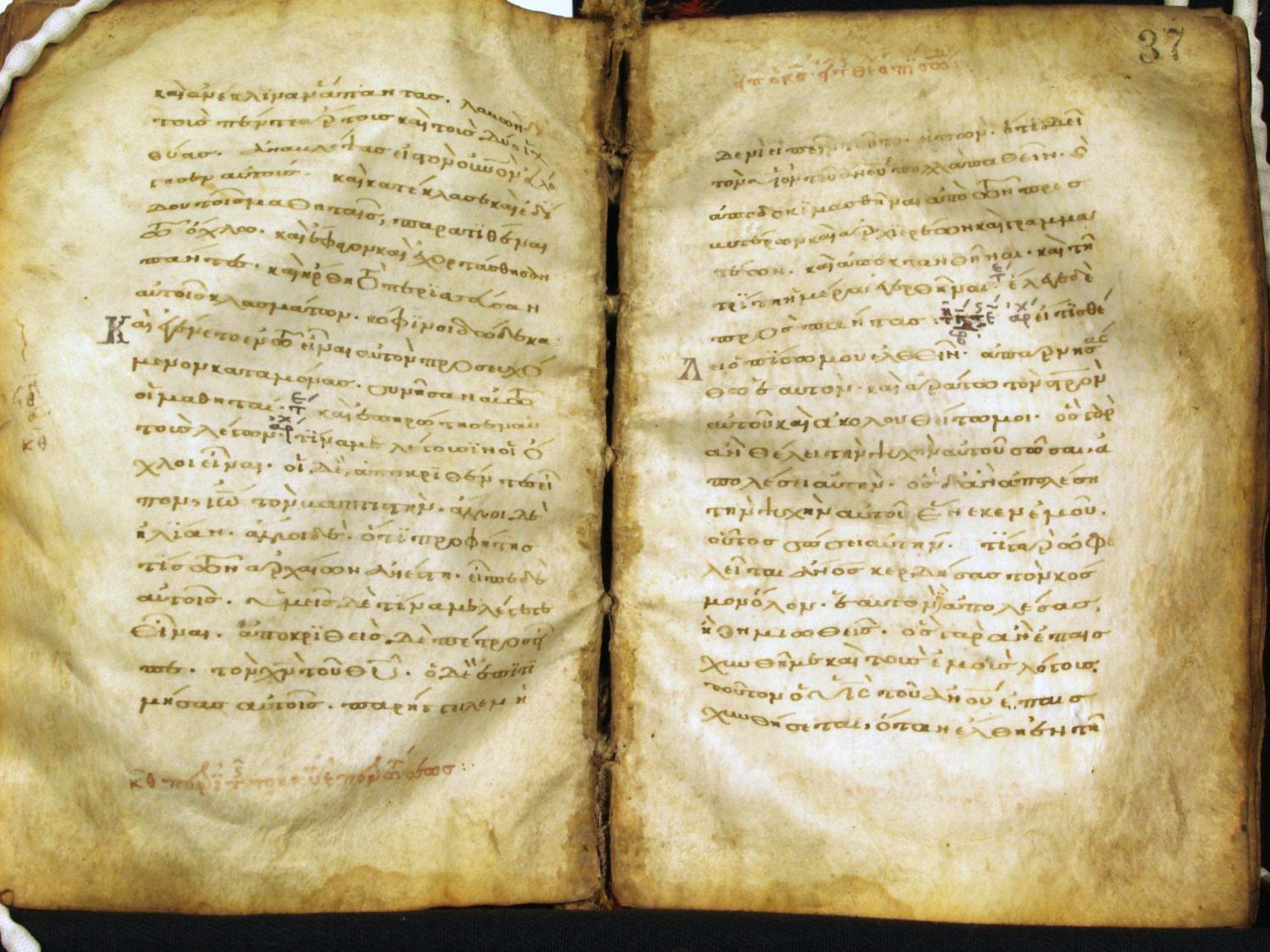 Eleventh century manuscript of the Gospels on parchment; 264 total leaves, 1 column, 20 lines per column. The manuscript is in two locations; both the portion at Muenster (148 leaves) and the portion at the National Library of Greece in Athens (116 leaves) have been digitized by CSNTM.