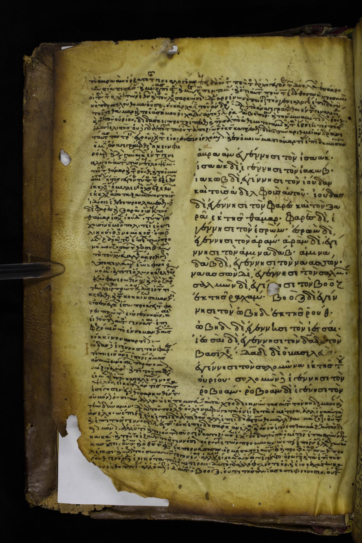 Ἀβραὰμ ἐγέννησεν τὸν Ἰσαάκ, Ἰσαὰκ δὲ ἐγέννησεν τὸν Ἰακώβ, Ἰακὼβ δὲ ἐγέννησεν τὸν Ἰούδαν καὶ τοὺς ἀδελφοὺς αὐτοῦ,