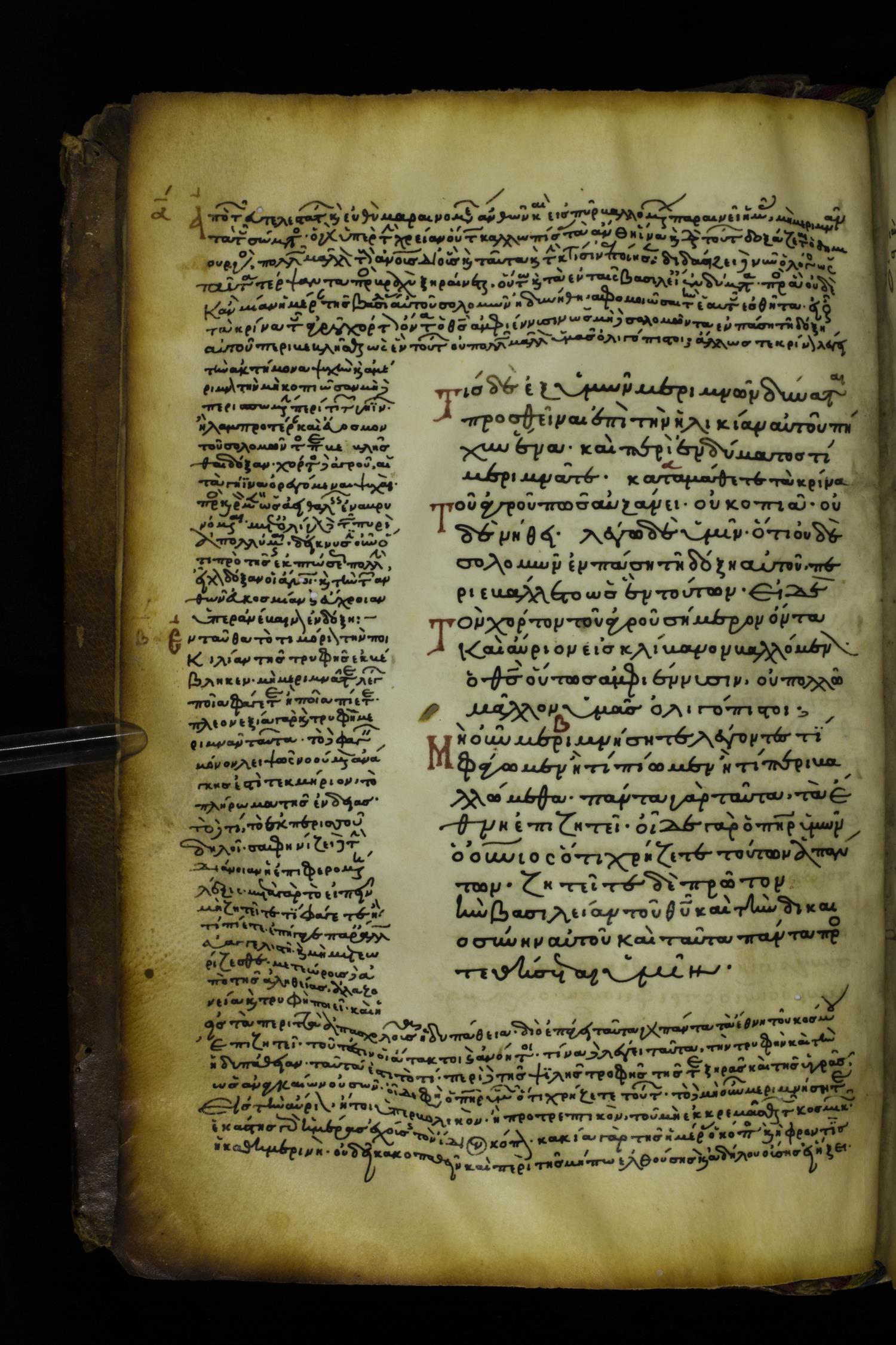 Twelfth or thirteenth century minuscule of the Gospels with commentary on parchment; 217 leaves, 1 column, 12-23 lines per page. Images were taken at the National Library of Greece in Athens.