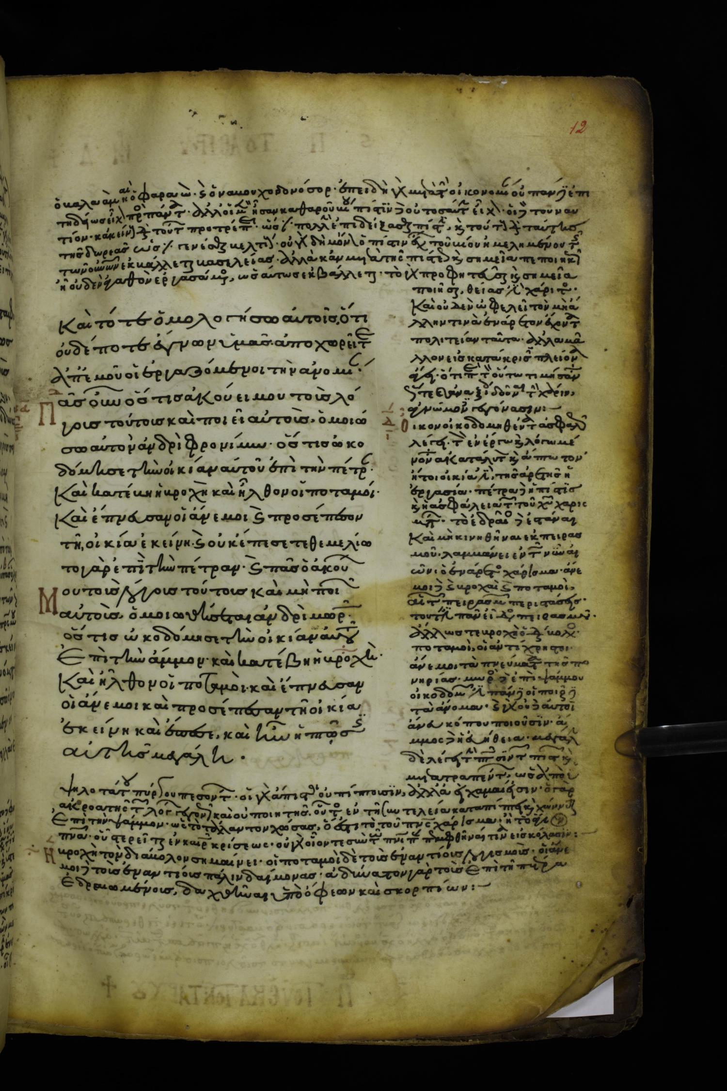 Twelfth or thirteenth century minuscule of the Gospels with commentary on parchment; 217 leaves, 1 column, 12-23 lines per page. Images were taken at the National Library of Greece in Athens.