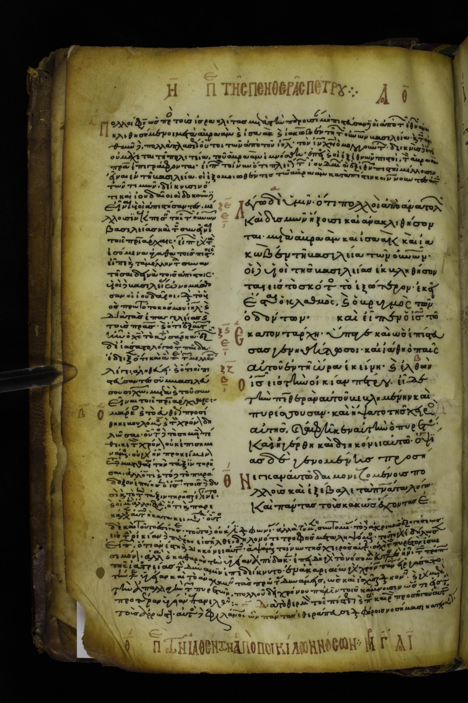 Twelfth or thirteenth century minuscule of the Gospels with commentary on parchment; 217 leaves, 1 column, 12-23 lines per page. Images were taken at the National Library of Greece in Athens.