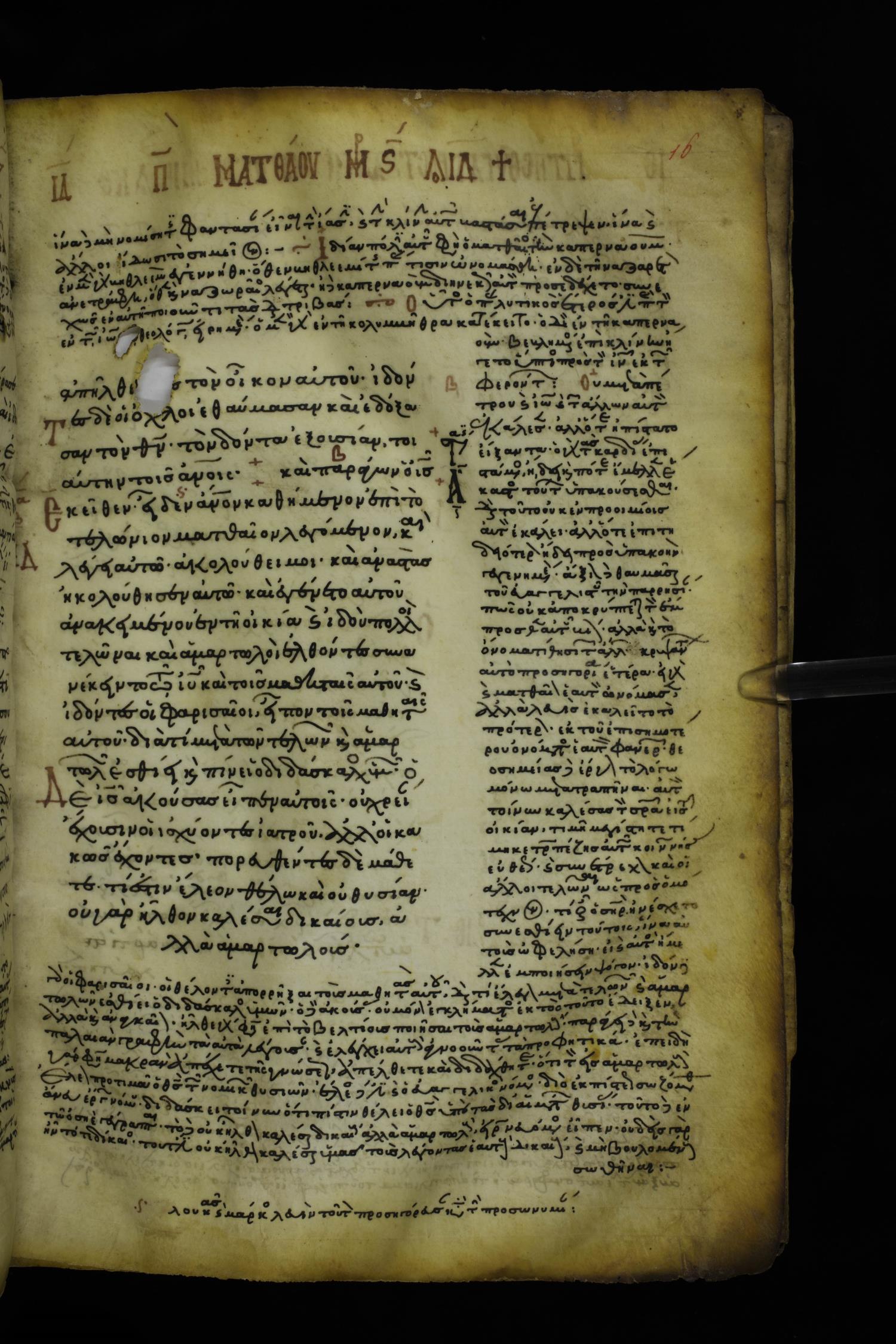 Twelfth or thirteenth century minuscule of the Gospels with commentary on parchment; 217 leaves, 1 column, 12-23 lines per page. Images were taken at the National Library of Greece in Athens.