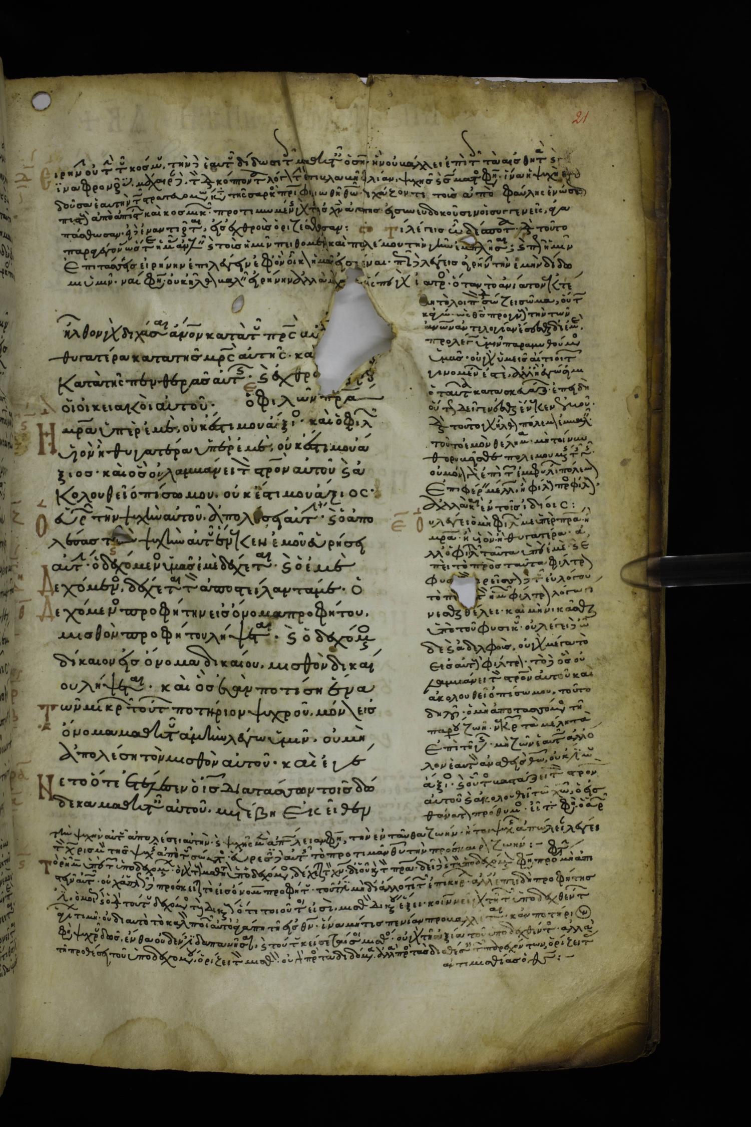 Twelfth or thirteenth century minuscule of the Gospels with commentary on parchment; 217 leaves, 1 column, 12-23 lines per page. Images were taken at the National Library of Greece in Athens.