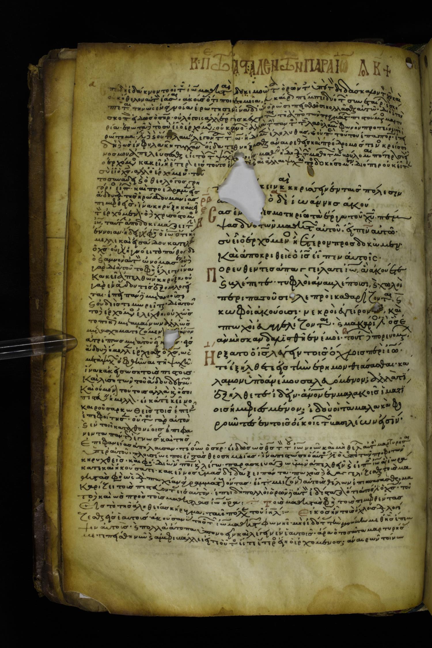 Twelfth or thirteenth century minuscule of the Gospels with commentary on parchment; 217 leaves, 1 column, 12-23 lines per page. Images were taken at the National Library of Greece in Athens.