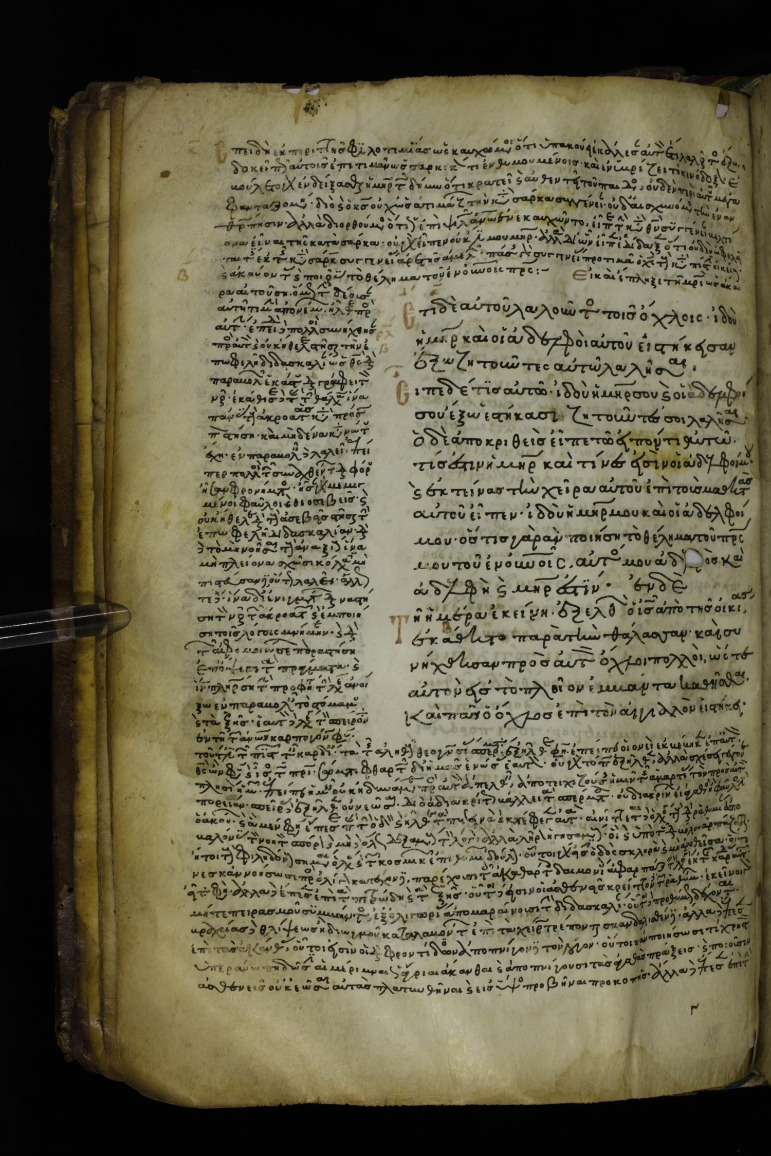 Twelfth or thirteenth century minuscule of the Gospels with commentary on parchment; 217 leaves, 1 column, 12-23 lines per page. Images were taken at the National Library of Greece in Athens.