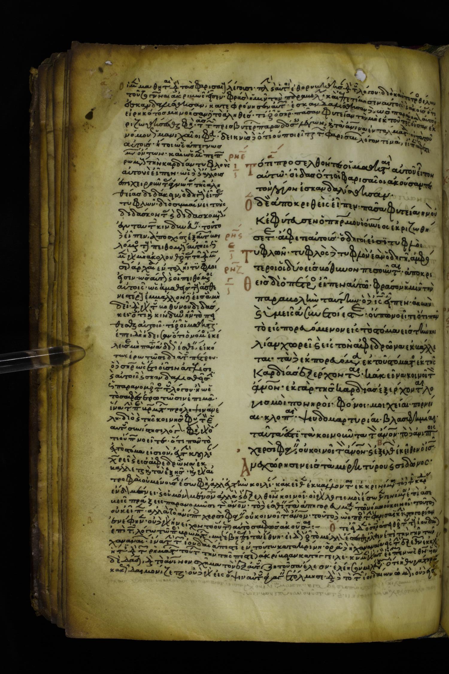 Twelfth or thirteenth century minuscule of the Gospels with commentary on parchment; 217 leaves, 1 column, 12-23 lines per page. Images were taken at the National Library of Greece in Athens.