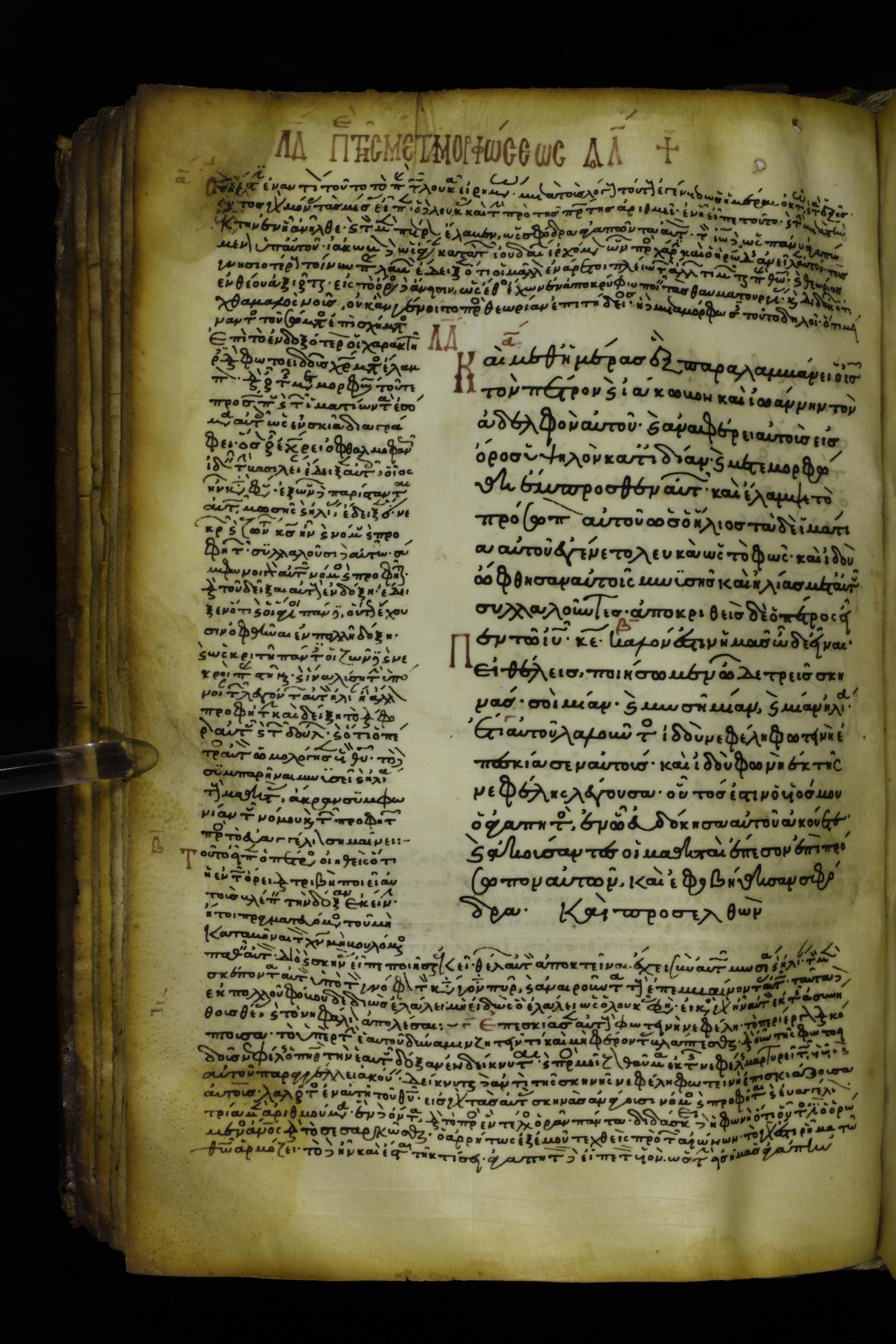 Twelfth or thirteenth century minuscule of the Gospels with commentary on parchment; 217 leaves, 1 column, 12-23 lines per page. Images were taken at the National Library of Greece in Athens.