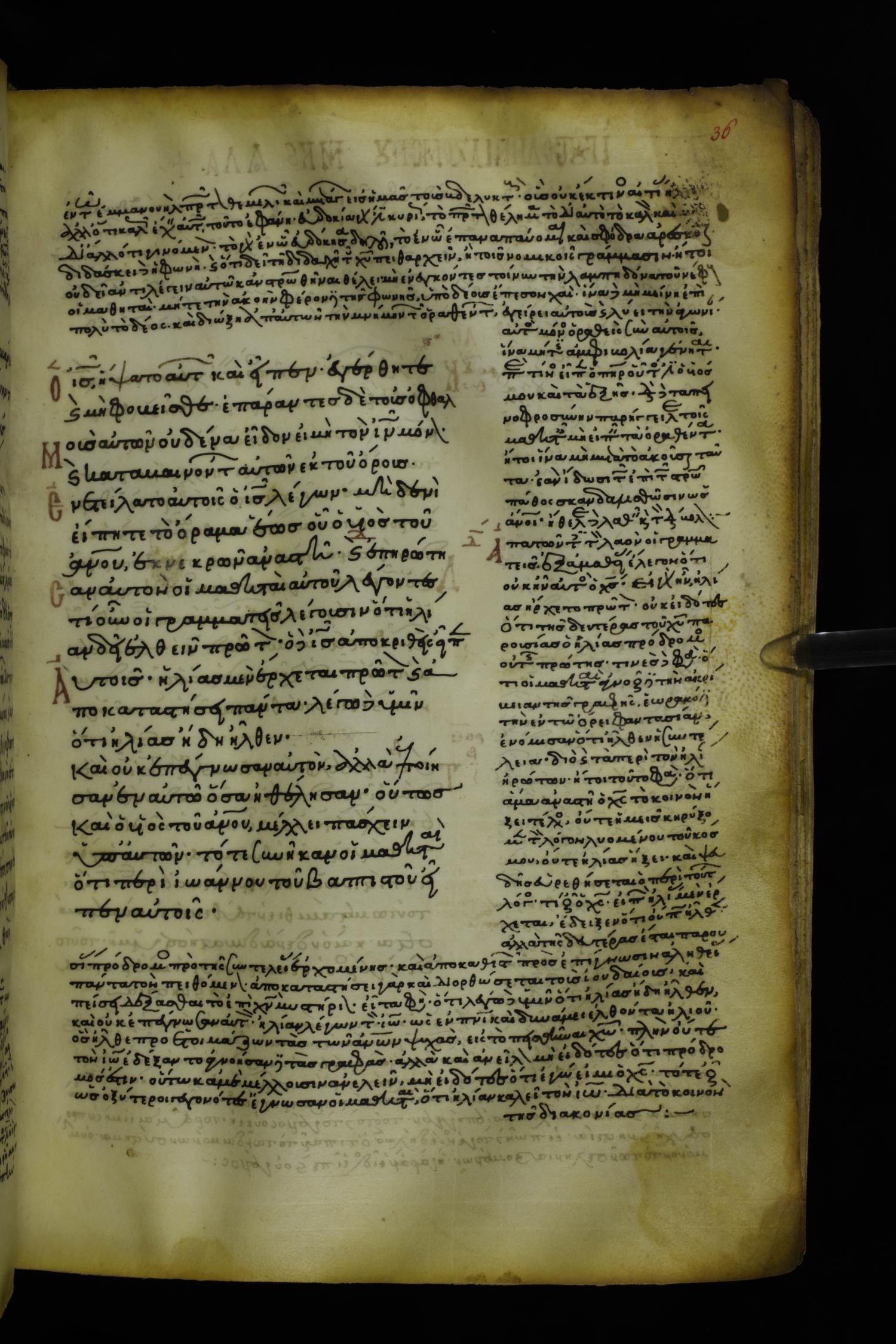 Twelfth or thirteenth century minuscule of the Gospels with commentary on parchment; 217 leaves, 1 column, 12-23 lines per page. Images were taken at the National Library of Greece in Athens.
