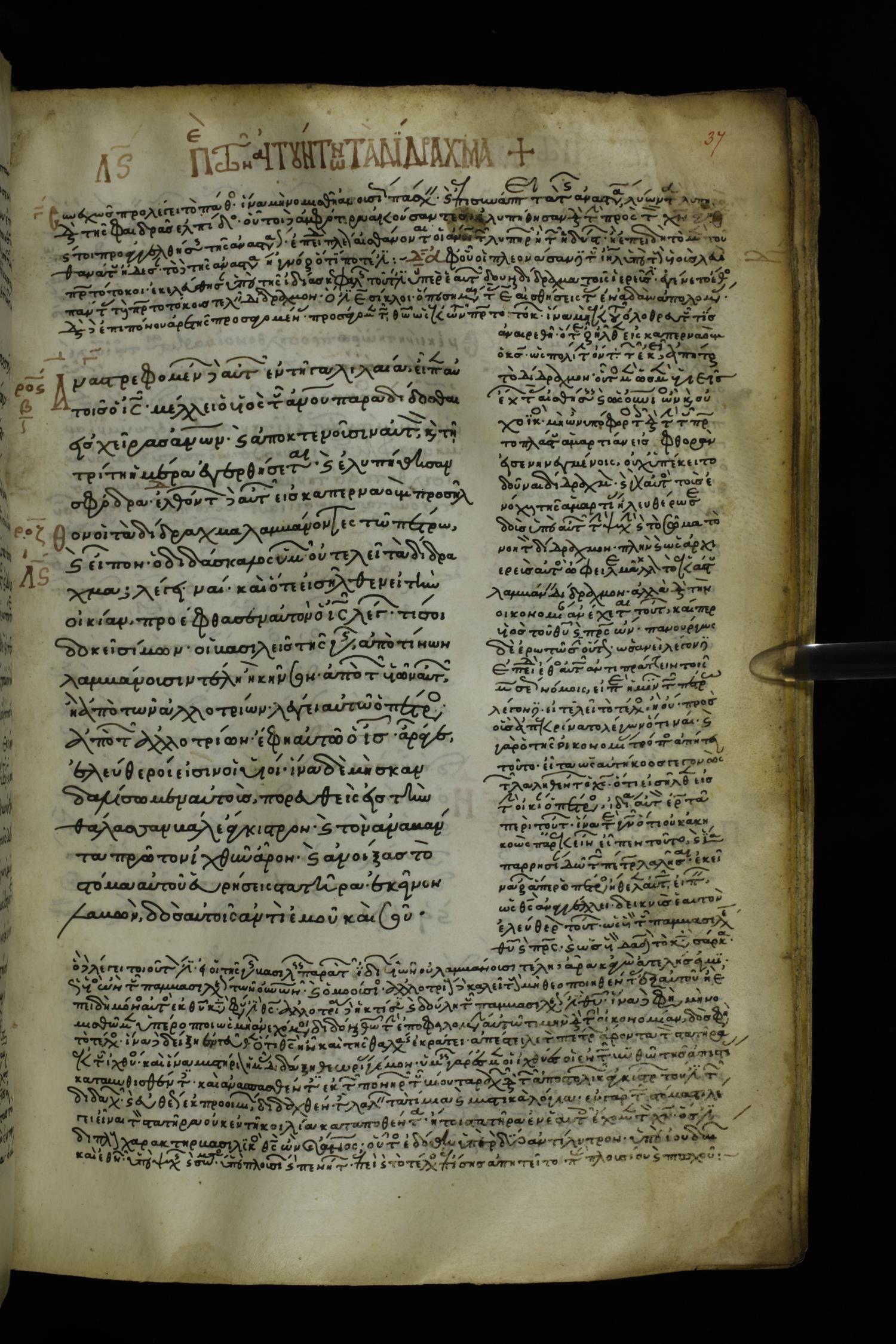 Twelfth or thirteenth century minuscule of the Gospels with commentary on parchment; 217 leaves, 1 column, 12-23 lines per page. Images were taken at the National Library of Greece in Athens.