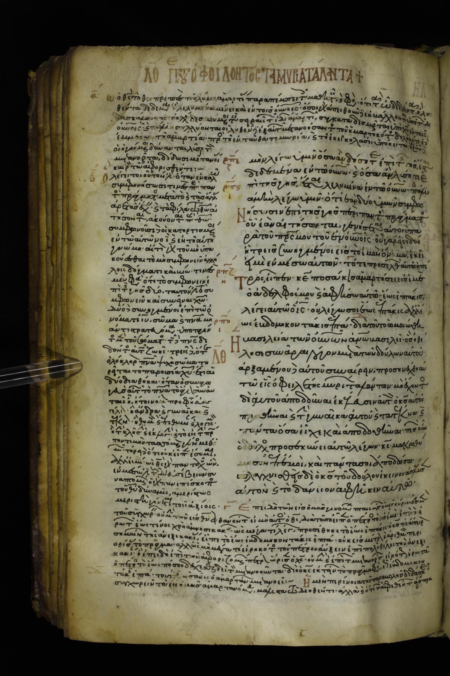 Twelfth or thirteenth century minuscule of the Gospels with commentary on parchment; 217 leaves, 1 column, 12-23 lines per page. Images were taken at the National Library of Greece in Athens.