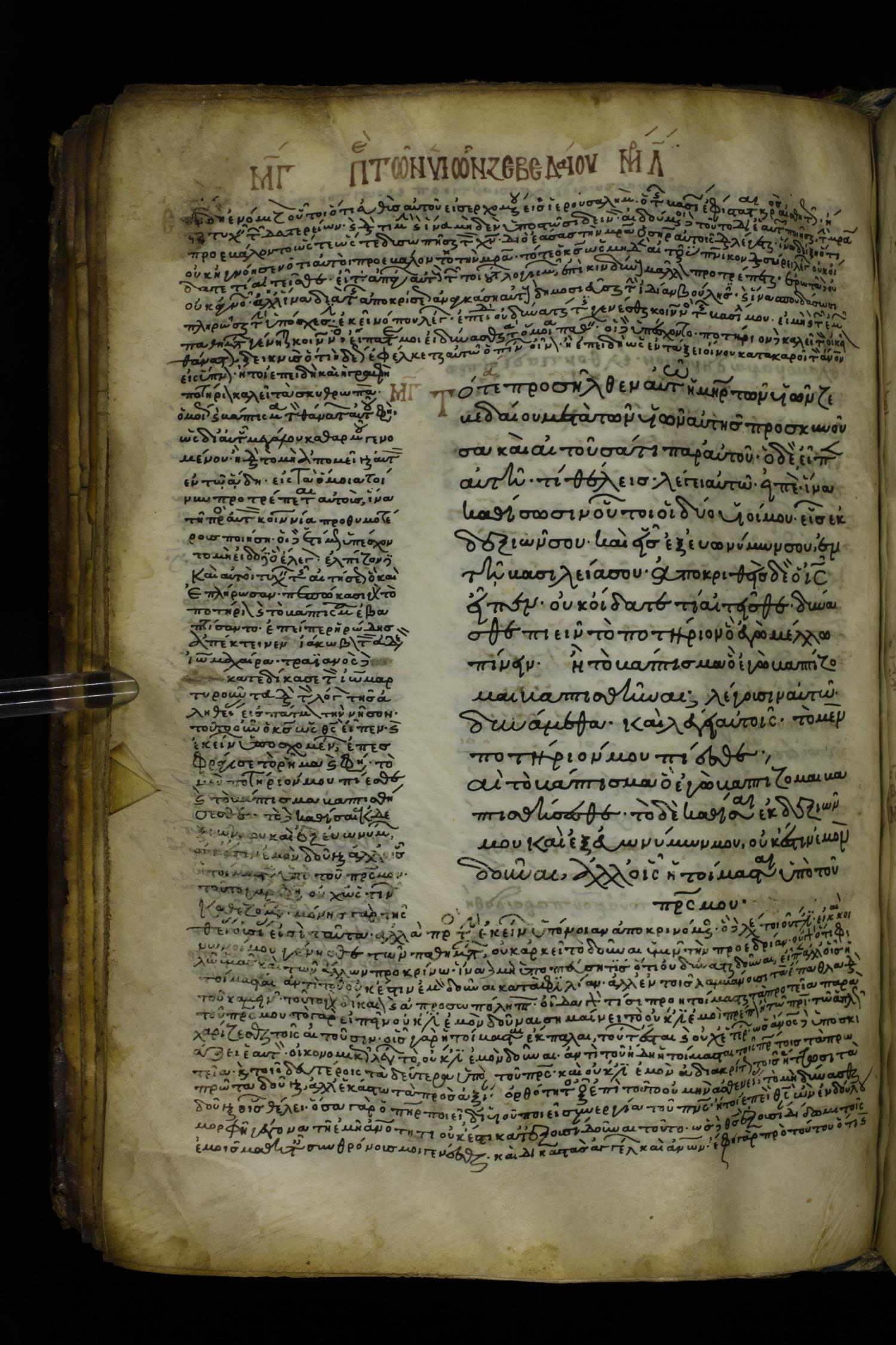 Twelfth or thirteenth century minuscule of the Gospels with commentary on parchment; 217 leaves, 1 column, 12-23 lines per page. Images were taken at the National Library of Greece in Athens.