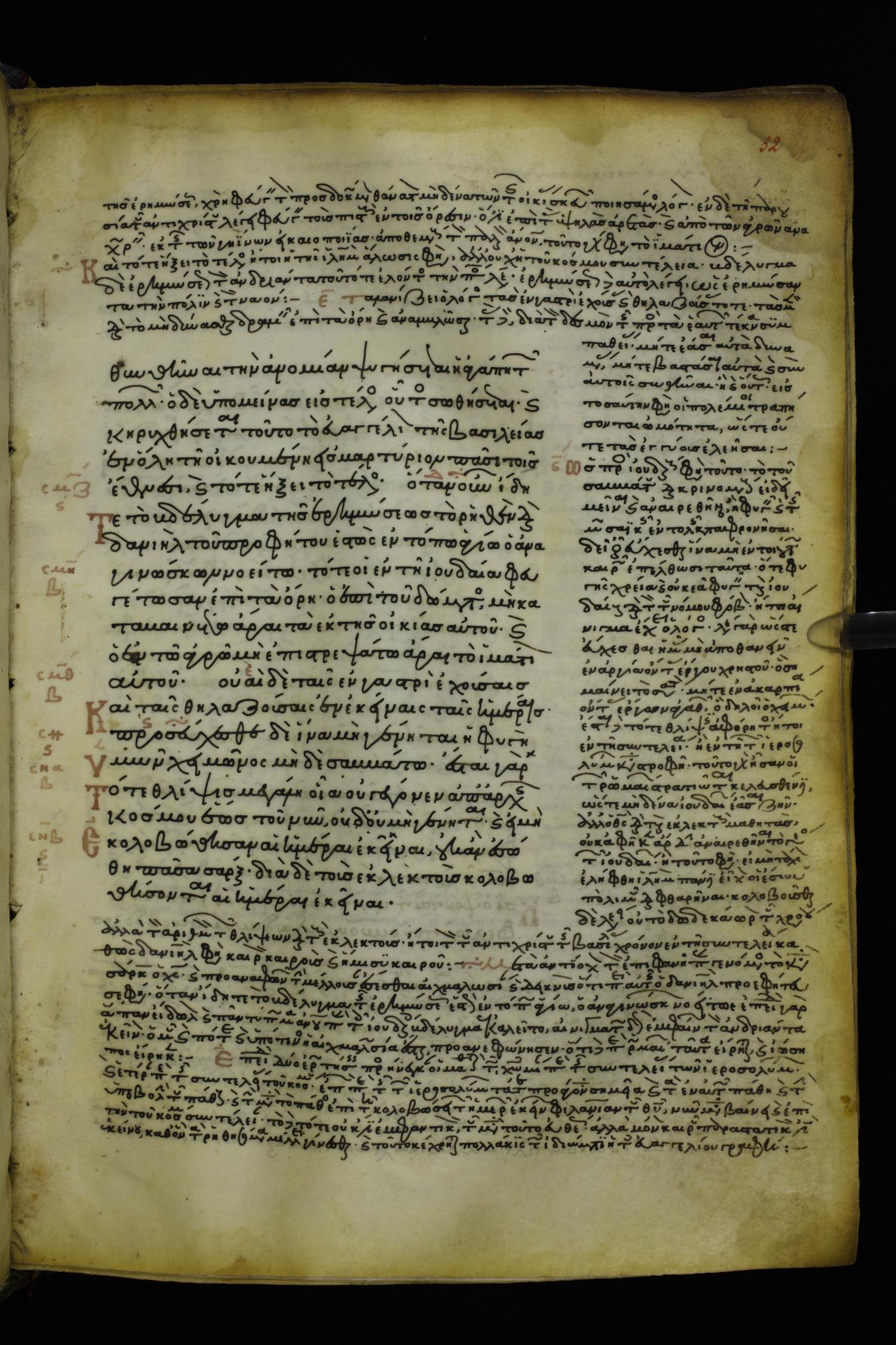 Twelfth or thirteenth century minuscule of the Gospels with commentary on parchment; 217 leaves, 1 column, 12-23 lines per page. Images were taken at the National Library of Greece in Athens.