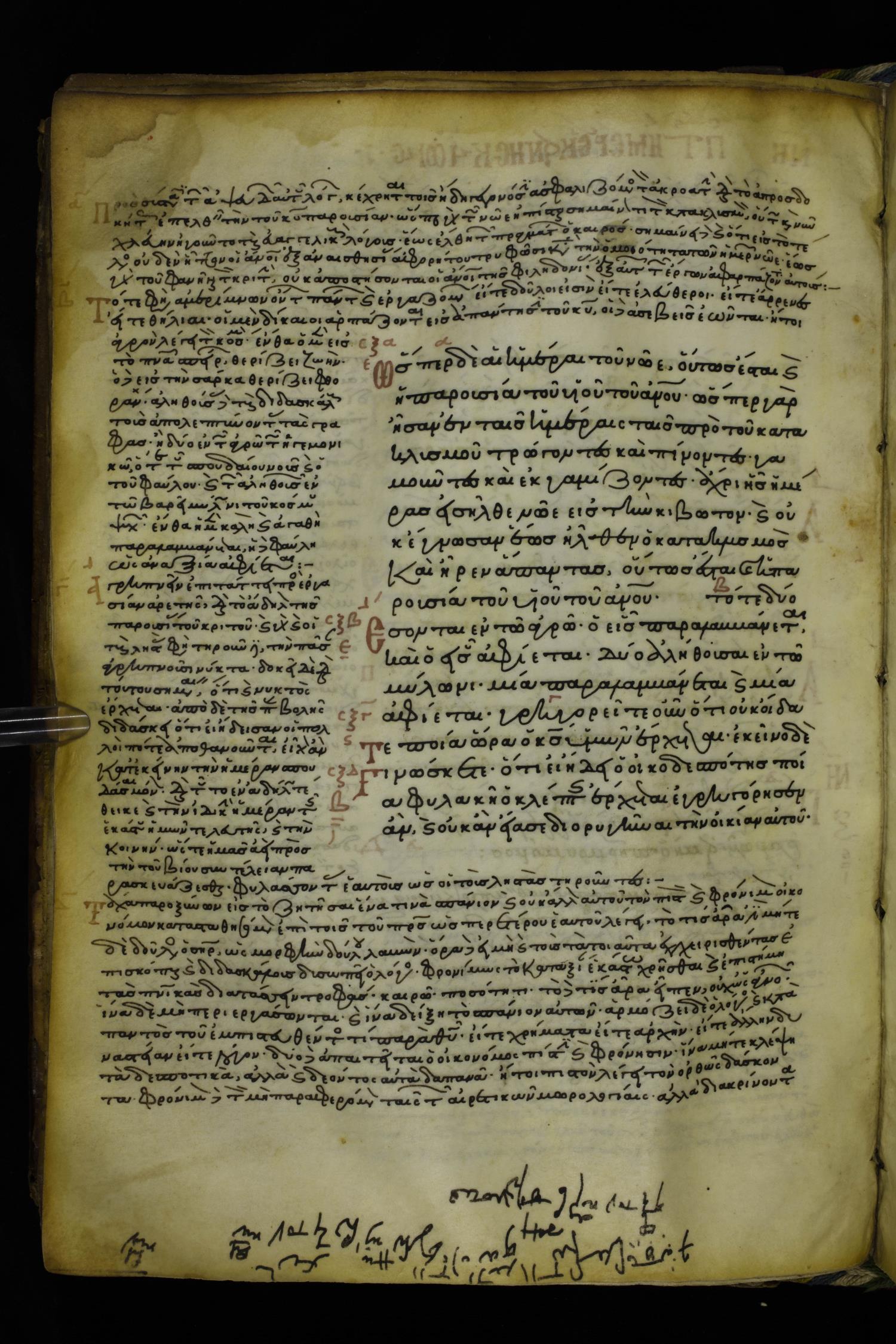 Twelfth or thirteenth century minuscule of the Gospels with commentary on parchment; 217 leaves, 1 column, 12-23 lines per page. Images were taken at the National Library of Greece in Athens.