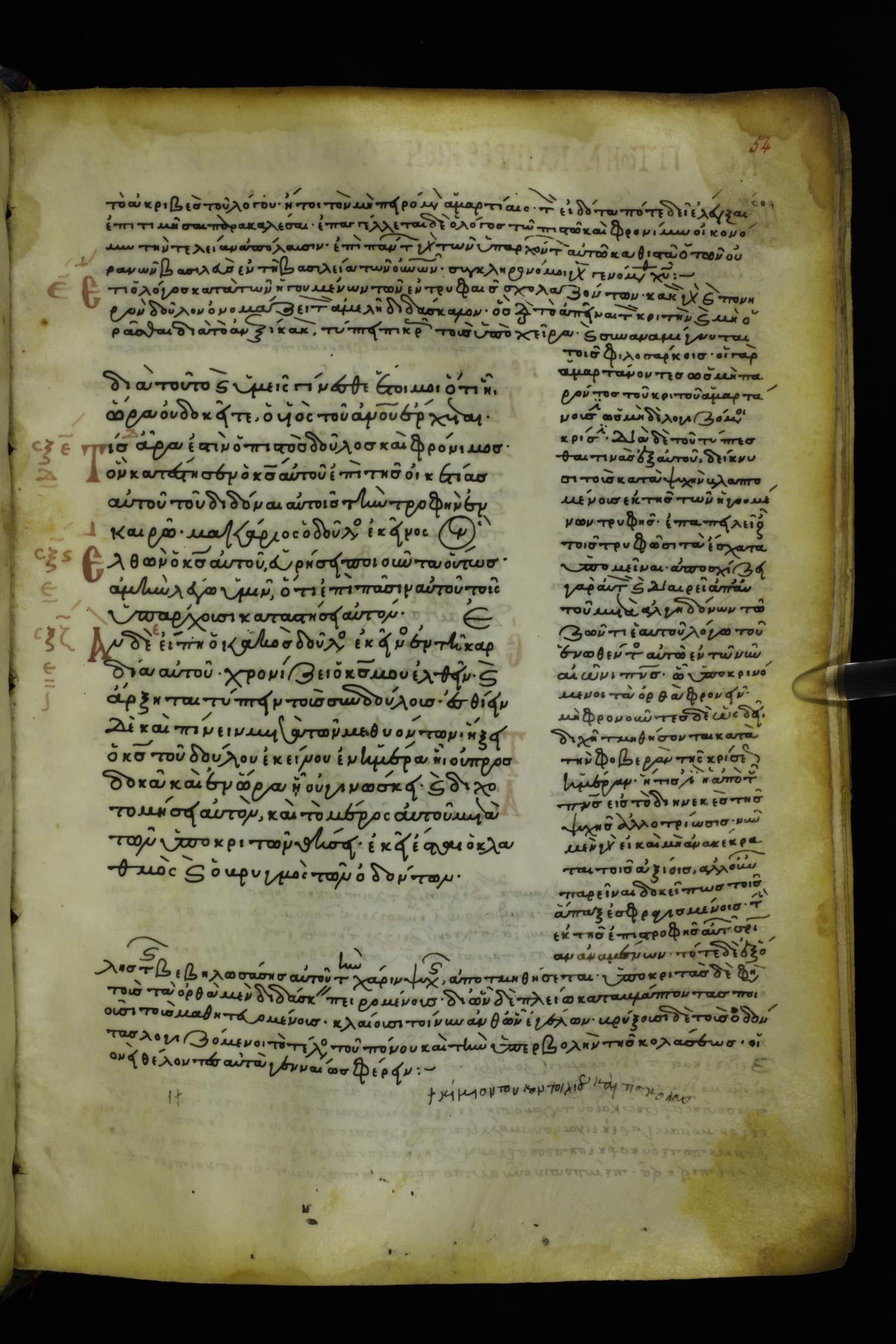 Twelfth or thirteenth century minuscule of the Gospels with commentary on parchment; 217 leaves, 1 column, 12-23 lines per page. Images were taken at the National Library of Greece in Athens.