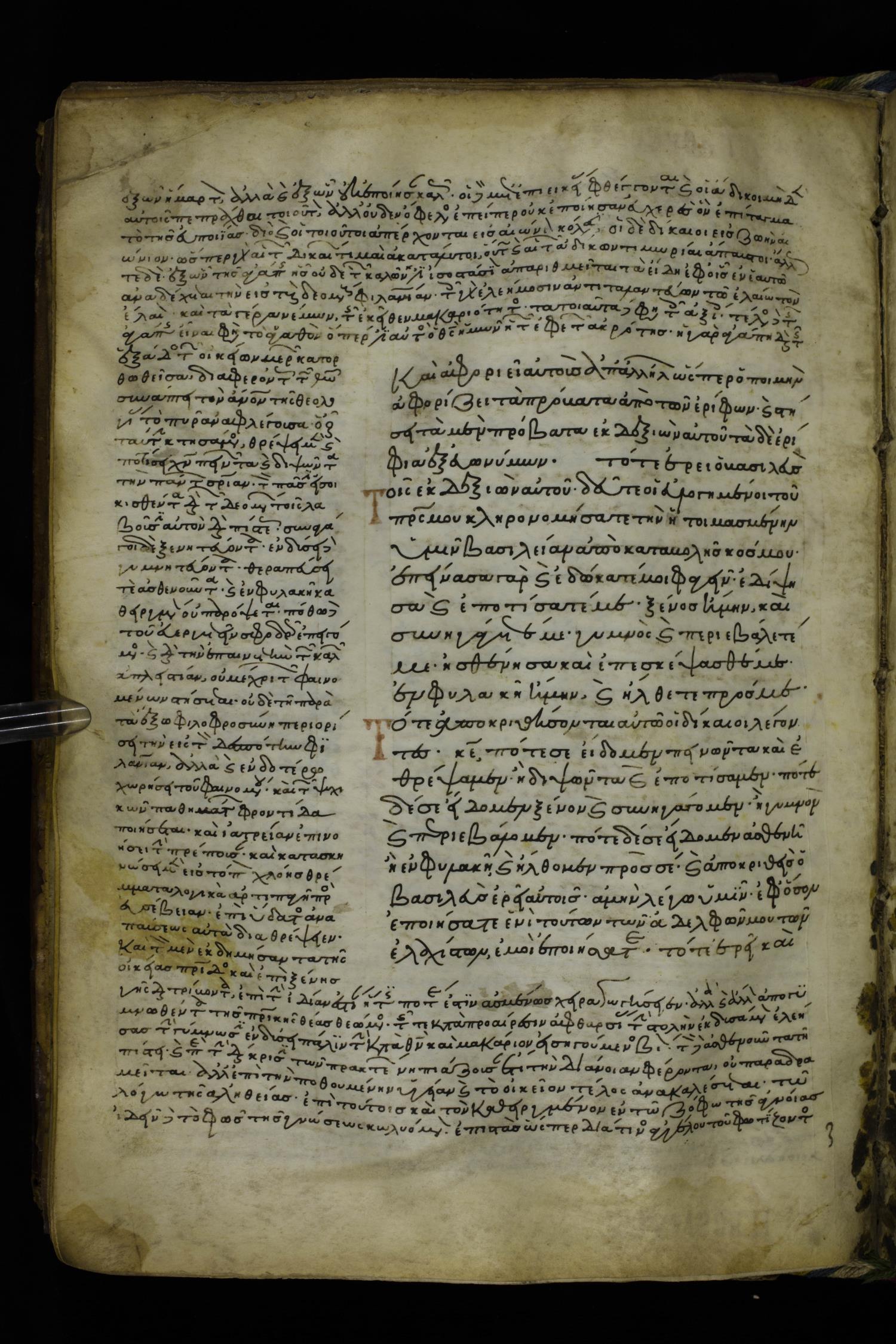 Twelfth or thirteenth century minuscule of the Gospels with commentary on parchment; 217 leaves, 1 column, 12-23 lines per page. Images were taken at the National Library of Greece in Athens.