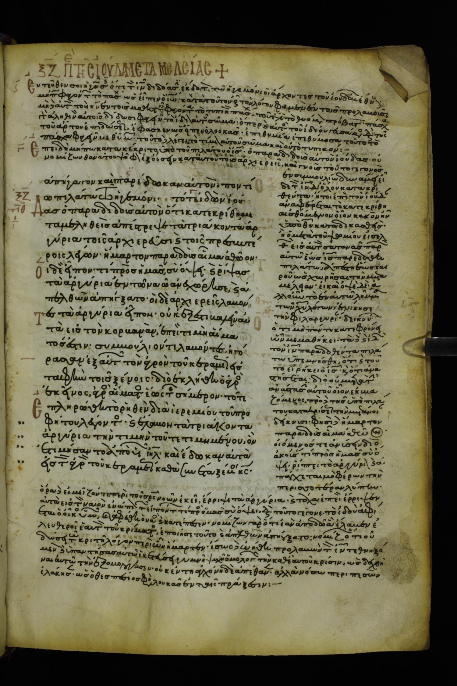 Twelfth or thirteenth century minuscule of the Gospels with commentary on parchment; 217 leaves, 1 column, 12-23 lines per page. Images were taken at the National Library of Greece in Athens.