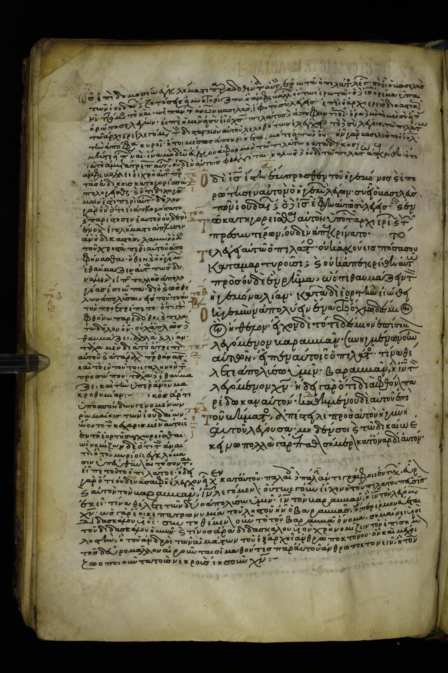 Twelfth or thirteenth century minuscule of the Gospels with commentary on parchment; 217 leaves, 1 column, 12-23 lines per page. Images were taken at the National Library of Greece in Athens.