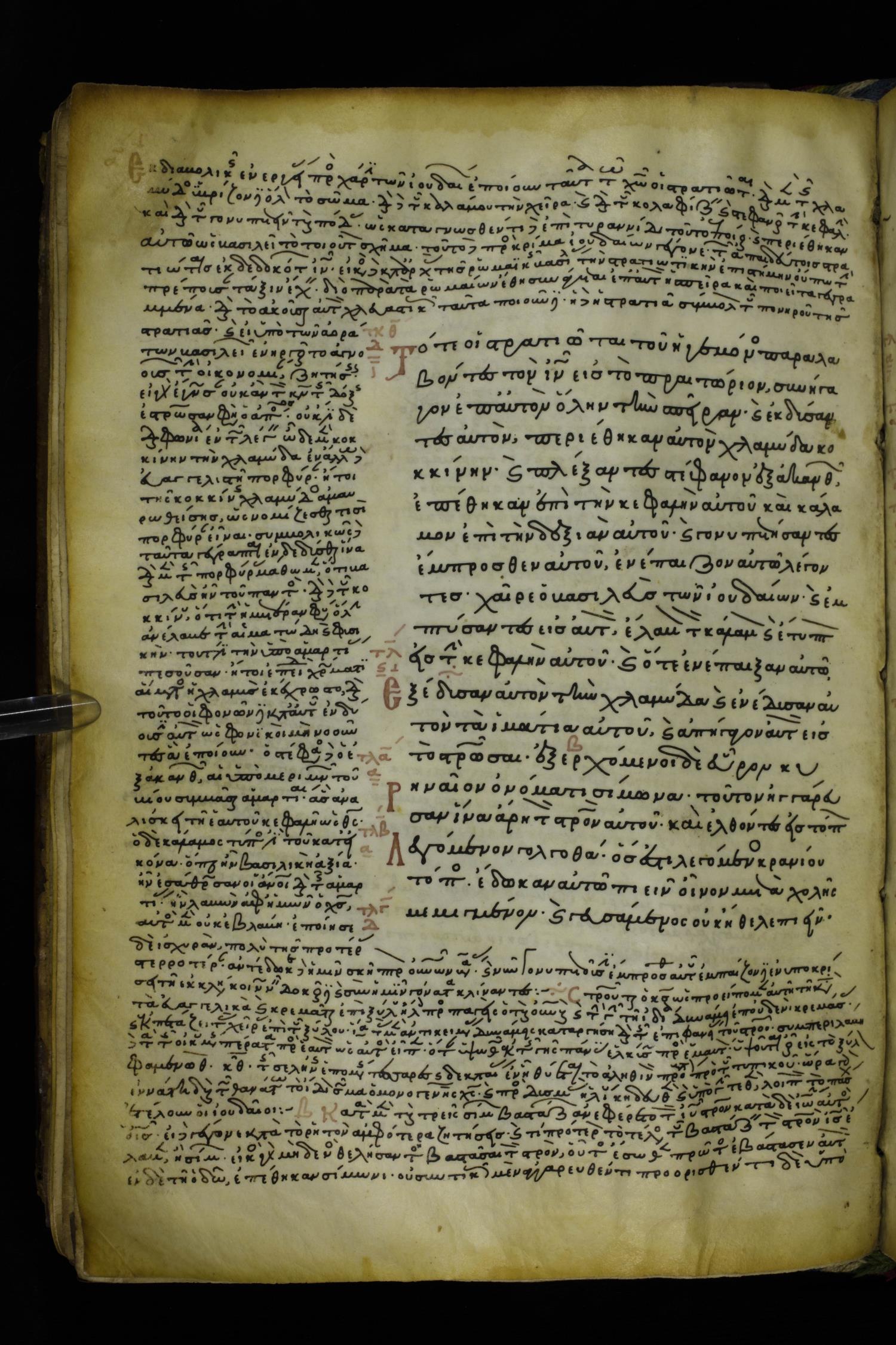 Twelfth or thirteenth century minuscule of the Gospels with commentary on parchment; 217 leaves, 1 column, 12-23 lines per page. Images were taken at the National Library of Greece in Athens.