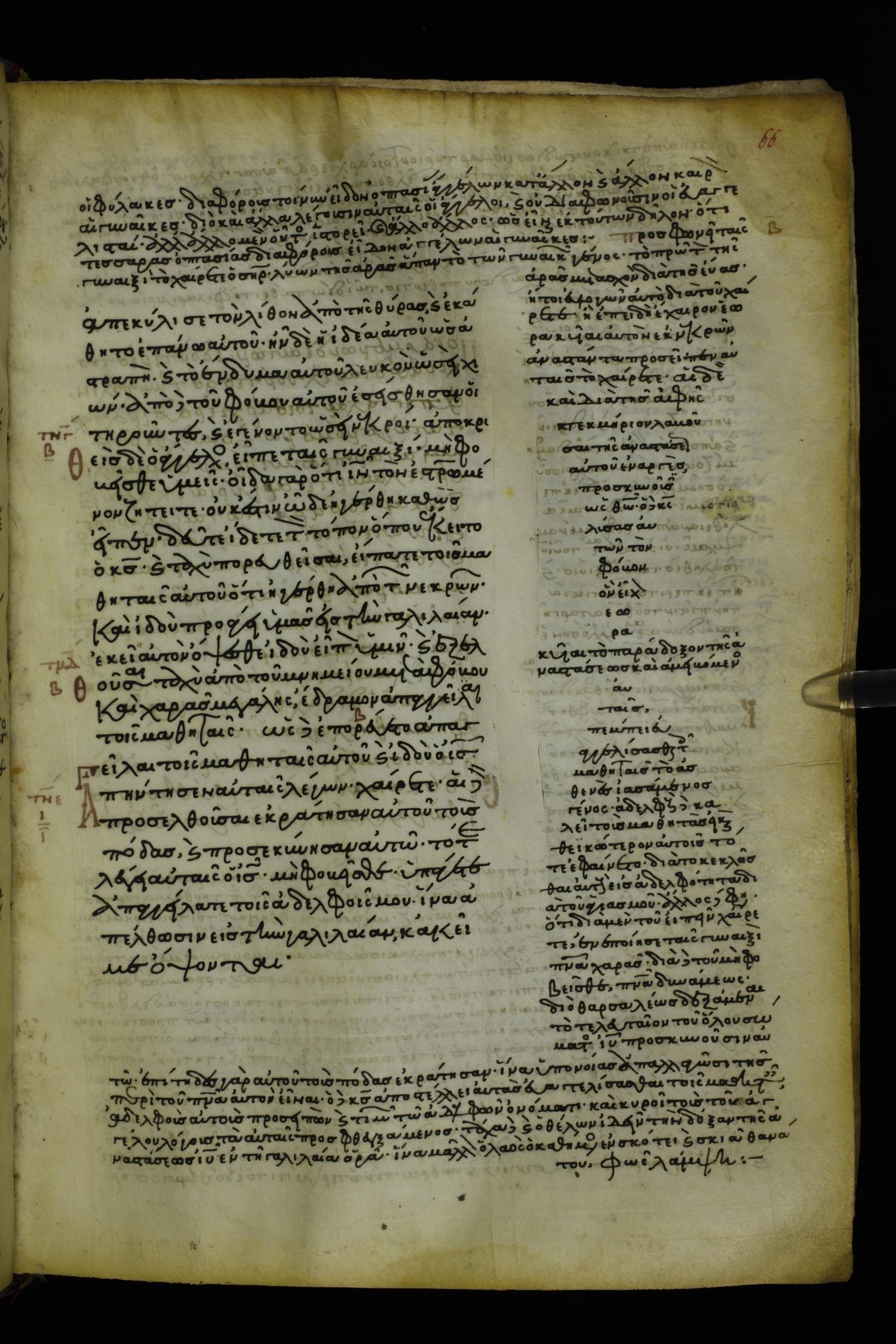 Twelfth or thirteenth century minuscule of the Gospels with commentary on parchment; 217 leaves, 1 column, 12-23 lines per page. Images were taken at the National Library of Greece in Athens.