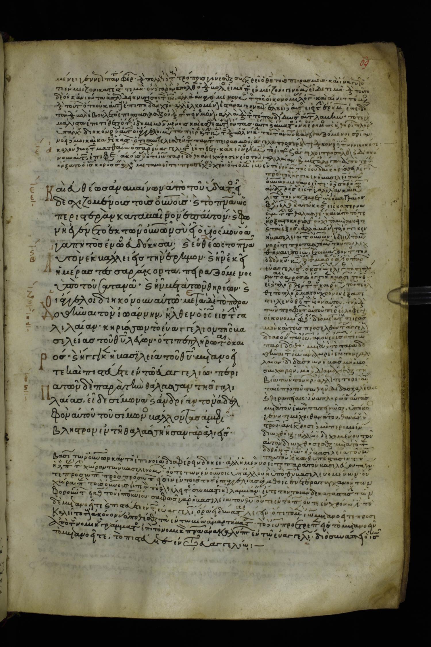 Twelfth or thirteenth century minuscule of the Gospels with commentary on parchment; 217 leaves, 1 column, 12-23 lines per page. Images were taken at the National Library of Greece in Athens.