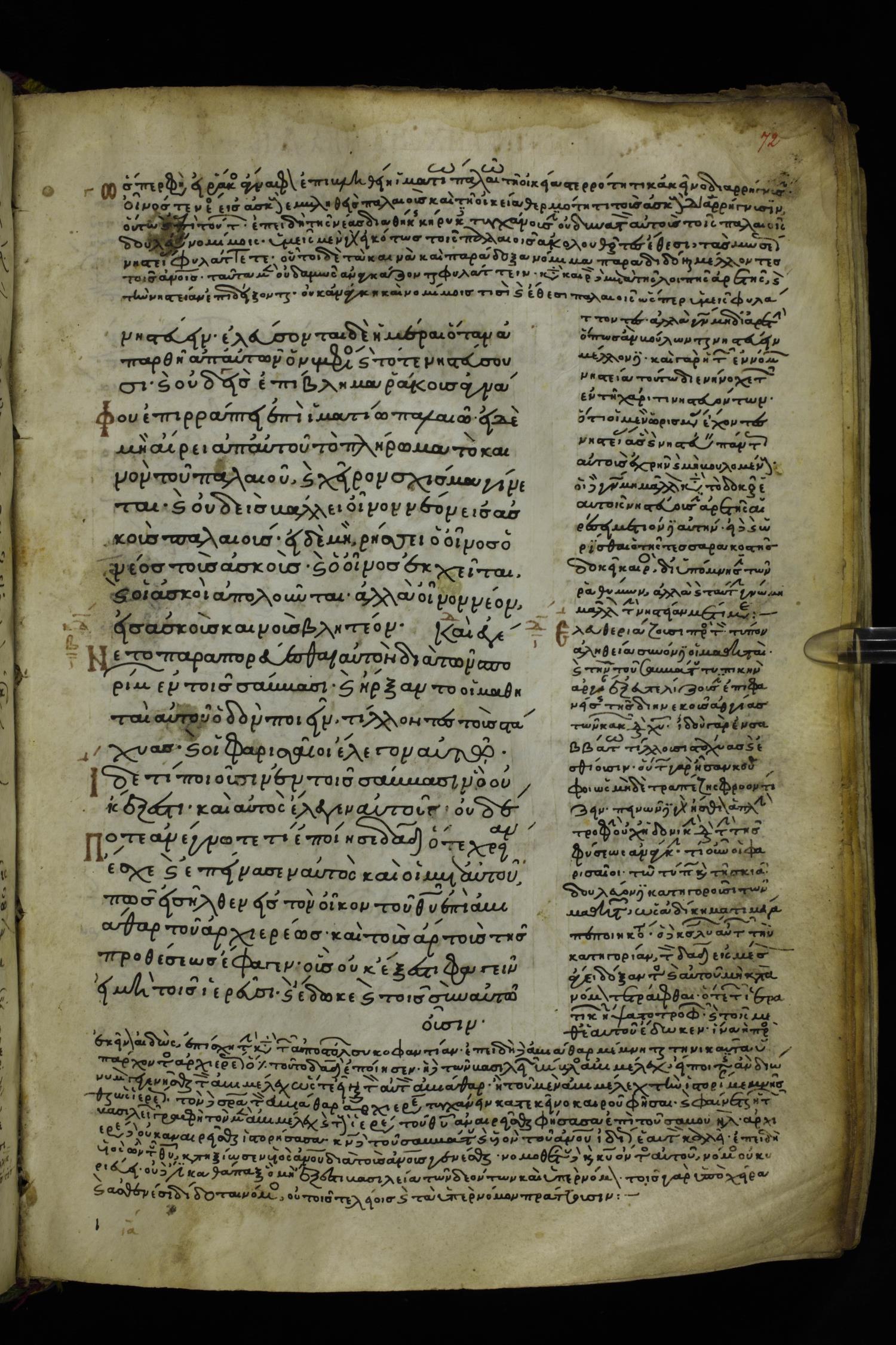 Twelfth or thirteenth century minuscule of the Gospels with commentary on parchment; 217 leaves, 1 column, 12-23 lines per page. Images were taken at the National Library of Greece in Athens.