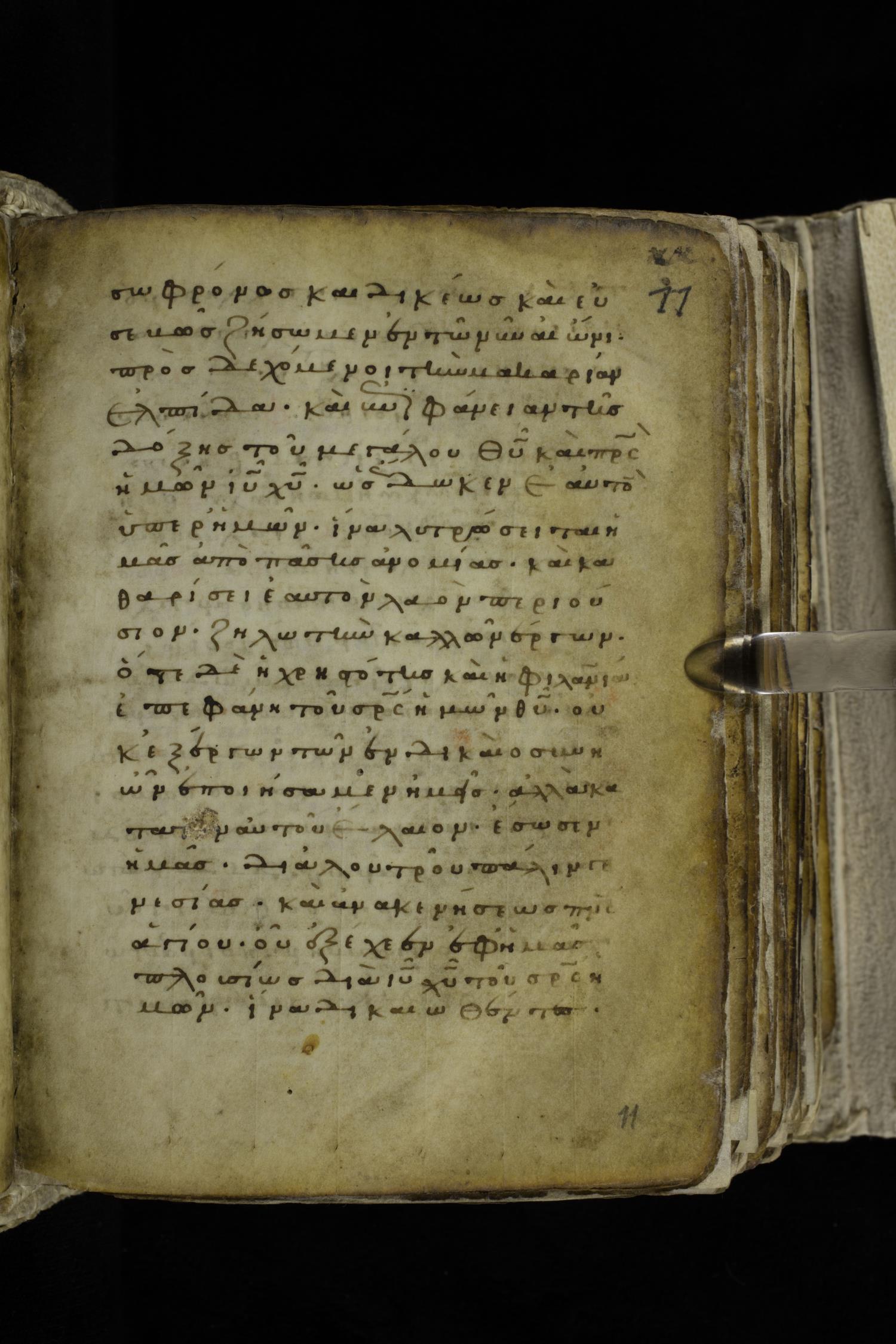 Eleventh century minuscule of the Gospels on parchment; 262 leaves, single column, 22-23 lines per column. Images were taken at the Hellenic Parliament Library in Athens.