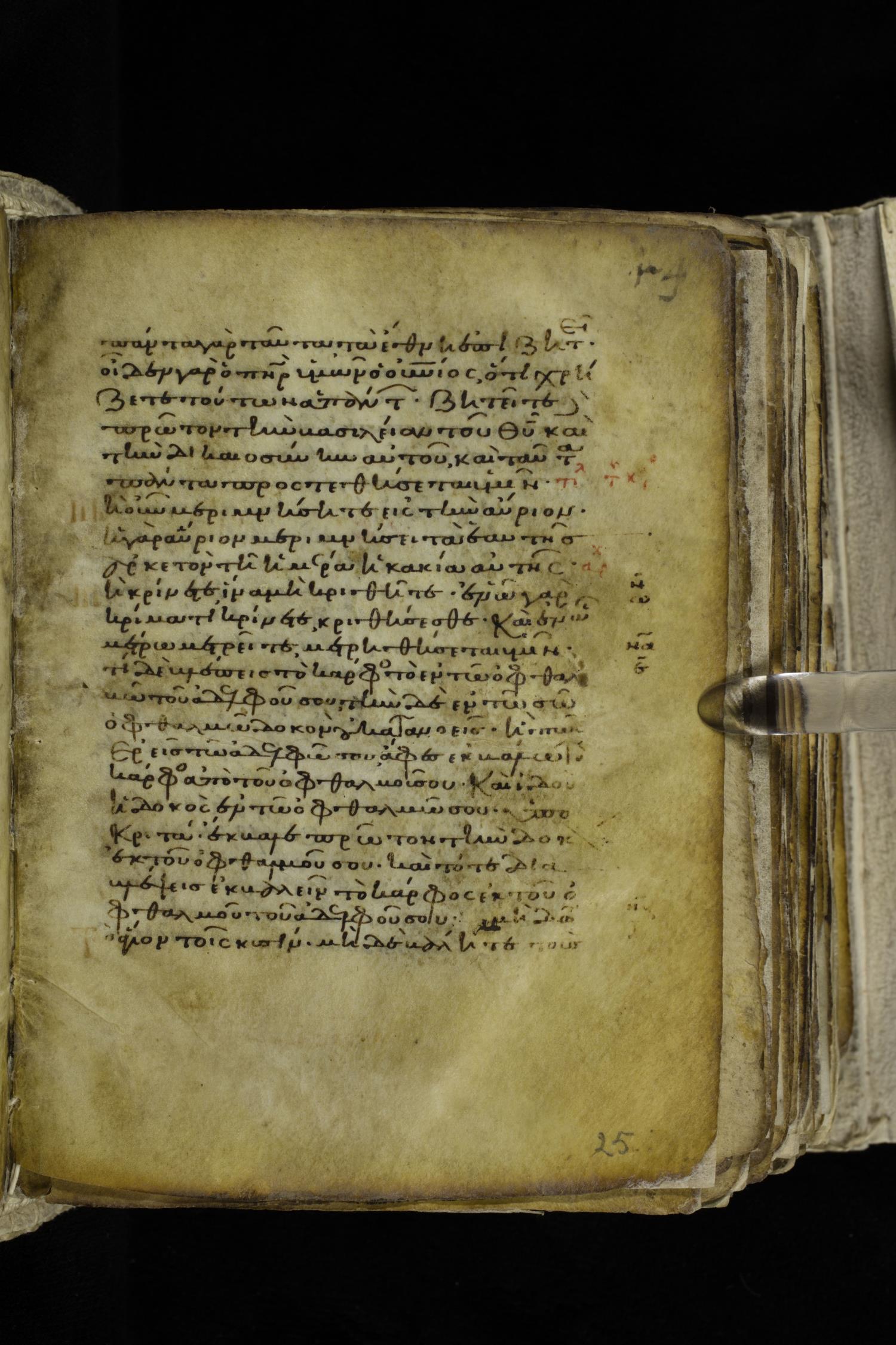 Eleventh century minuscule of the Gospels on parchment; 262 leaves, single column, 22-23 lines per column. Images were taken at the Hellenic Parliament Library in Athens.