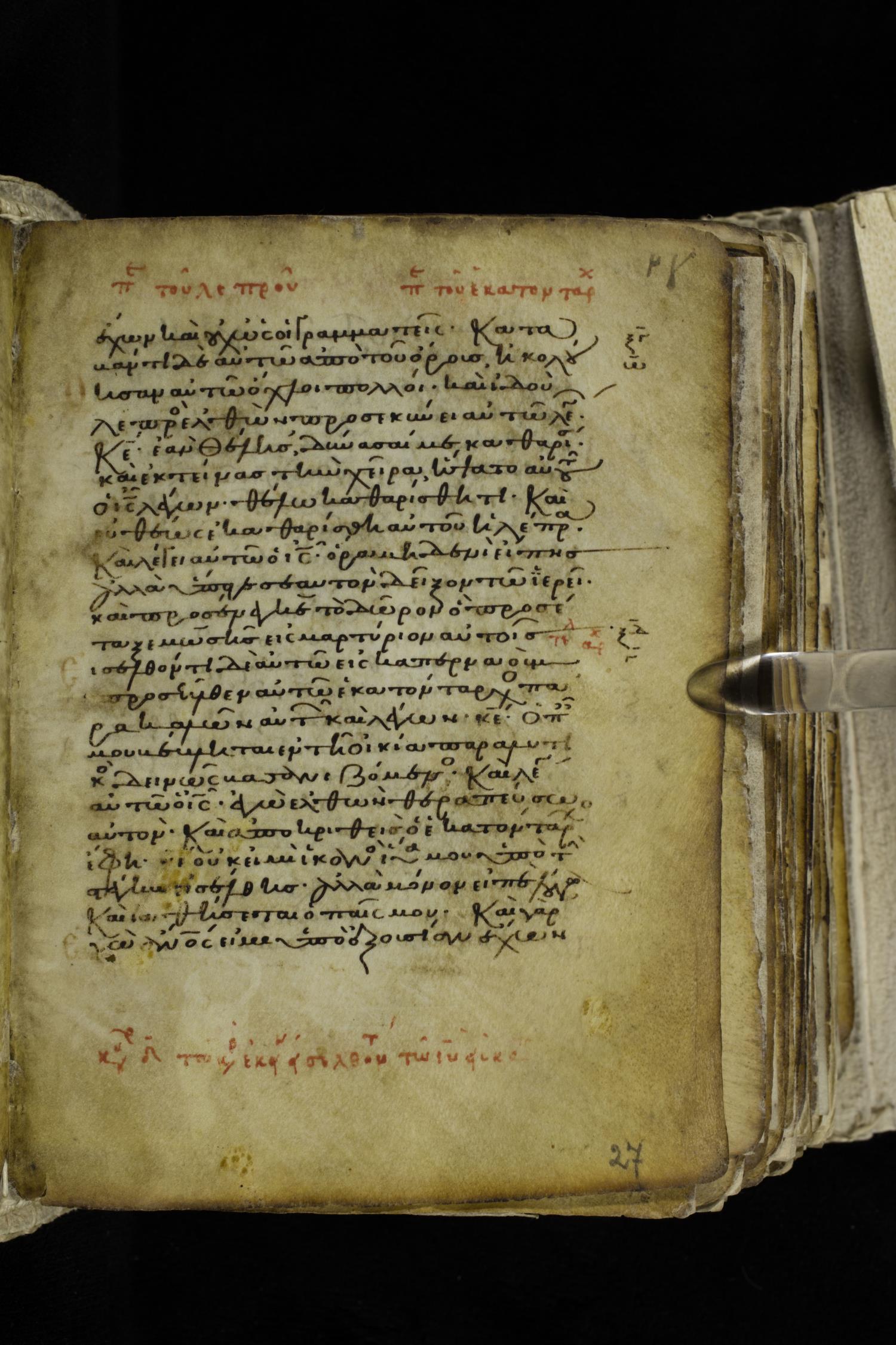 Eleventh century minuscule of the Gospels on parchment; 262 leaves, single column, 22-23 lines per column. Images were taken at the Hellenic Parliament Library in Athens.