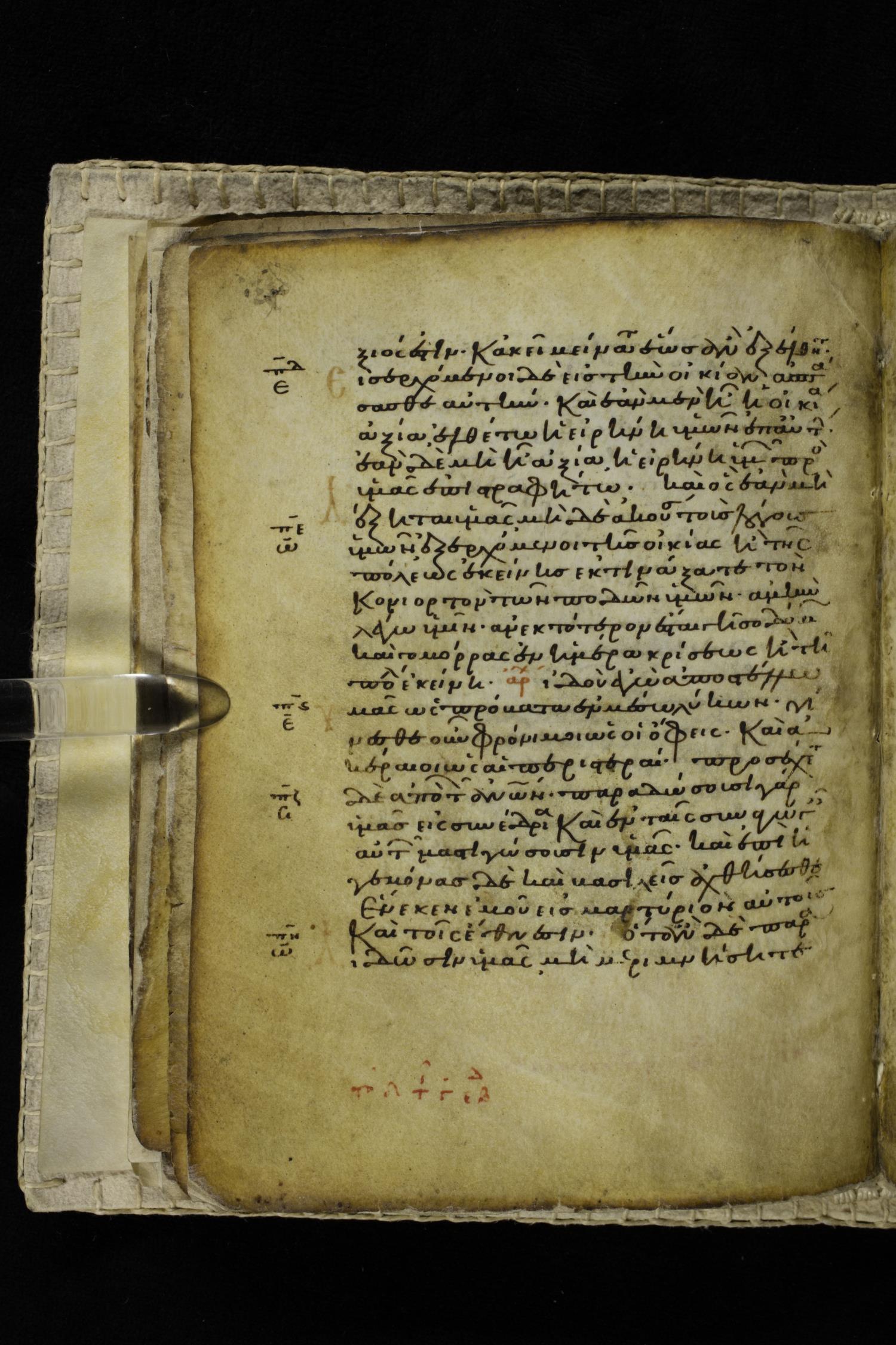 Eleventh century minuscule of the Gospels on parchment; 262 leaves, single column, 22-23 lines per column. Images were taken at the Hellenic Parliament Library in Athens.
