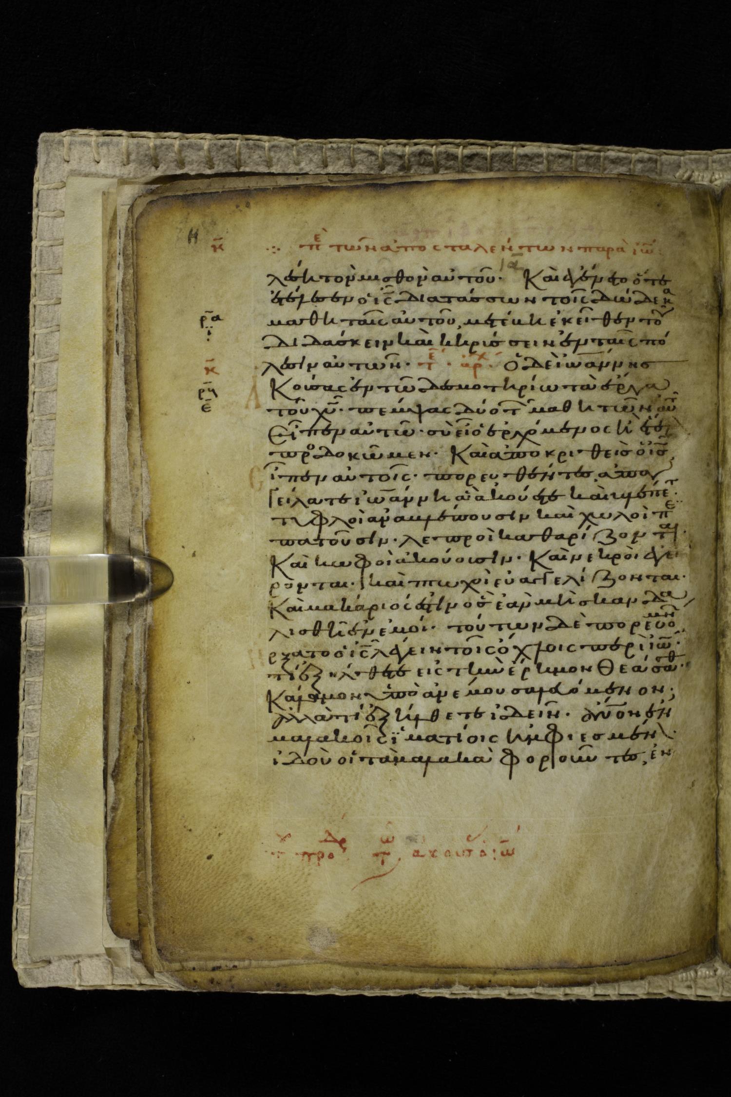 Eleventh century minuscule of the Gospels on parchment; 262 leaves, single column, 22-23 lines per column. Images were taken at the Hellenic Parliament Library in Athens.